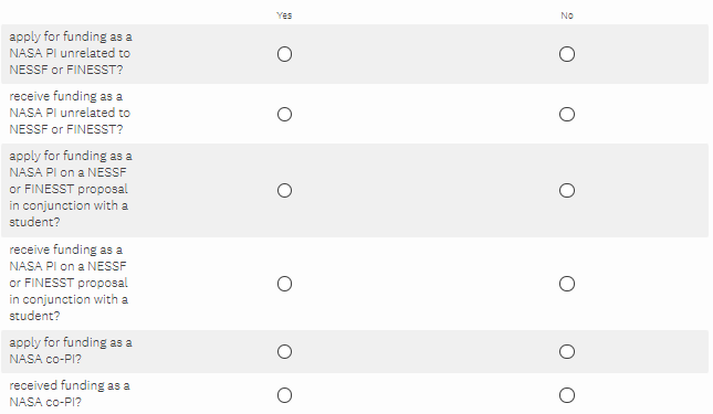 NASA Earth and Space Science Fellowship Survey Welcome! As a past NESSF proposer, you have been selected to take part in a brief questionnaire about your experiences.