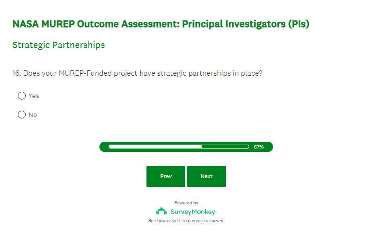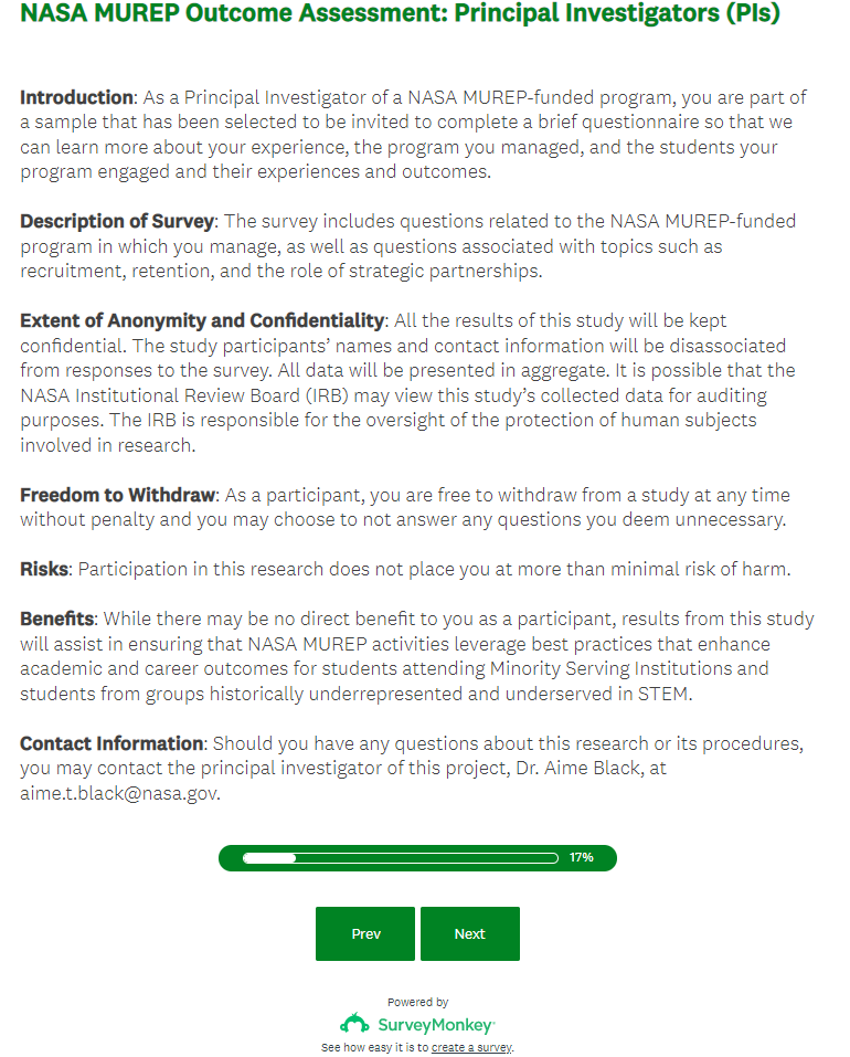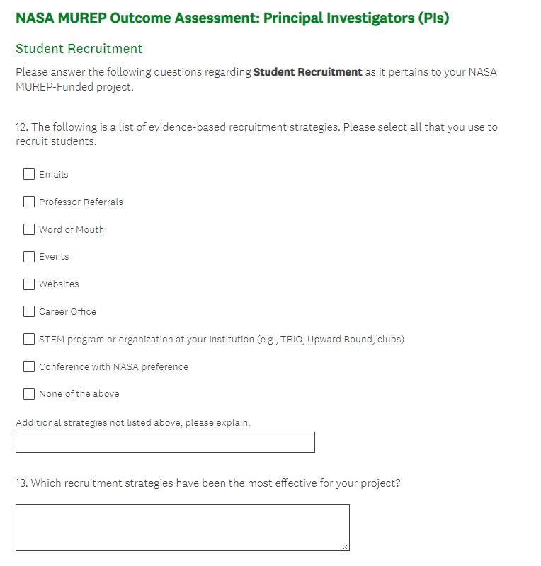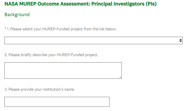 NASA MUREP Outcome Assessment - PI Survey Screenshots
