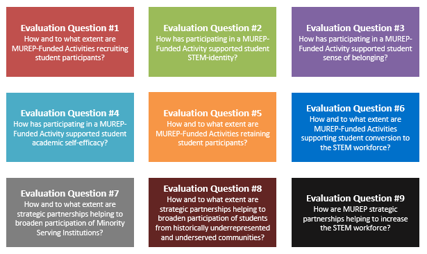 RESEARCH DESIGN OVERVIEW: NASA’s work in STEM Engagement is focused on serving students. MUREP provides support via competitive opportunities and awards to MSIs. MUREP investments enhance the research, academic, and technology capabilities of MSIs through multiyear cooperative agreements, bolstering their capacity in educating and preparing students for STEM careers. MUREP will continue to expand competitive opportunities to address specific gaps needs while building capacity at institutions. The two instruments (principal investigator survey and student survey) collect stakeholders’ perceptions that can support NASA’s continued improvement of the MUREP portfolio, and measure student outcomes of participation in NASA MUREP-funded programs, activities, and/or resources. Recruitment, STEM Identity, Sense of Belonging, Retention and Self-Efficacy are measures of interest. This study is program evaluation and will be guided by nine evaluation questions for the approach and design of this study. Evaluation questions are presented in Figure 1 below.