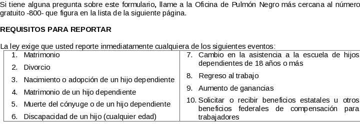 AVISO IMPORTANTE: Este REPORTE ANUAL DE CAMBIOS debe completarse, firmarse, fecharse y devolverse a más tardar treinta (30) días después de su recepción. A continuación, encontrará información sobre los beneficios federales de pulmón negro del beneficiario. Si la información no es correcta o si tiene cambios para reportar, ingrese la nueva información en el espacio proporcionado debajo de cada afirmación o pregunta. |