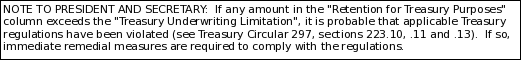 | Report each risk written in excess of the underwriting limitation established by the Treasury. (This applies to casualty and other lines of business as well as surety risks whether or not the United States is obligee.) In protecting excess risks, the underwriting limitation in force on the date of the execution of the risk, as shown in Treasury Circular 570, will govern absolutely. | |||||||||||||