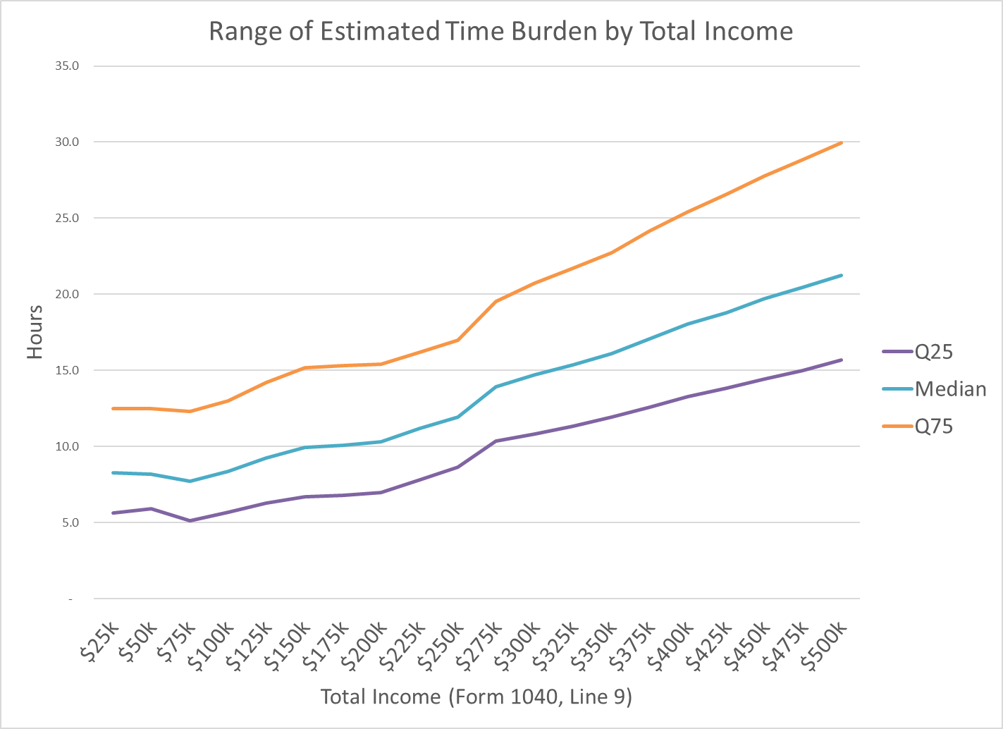 Note: Reported time and cost burdens are national averages and do not necessarily reflect a “typical” case. Most taxpayers experience lower than average burden, with taxpayer burden varying considerably by taxpayer type. Detail may not add to total due to rounding.