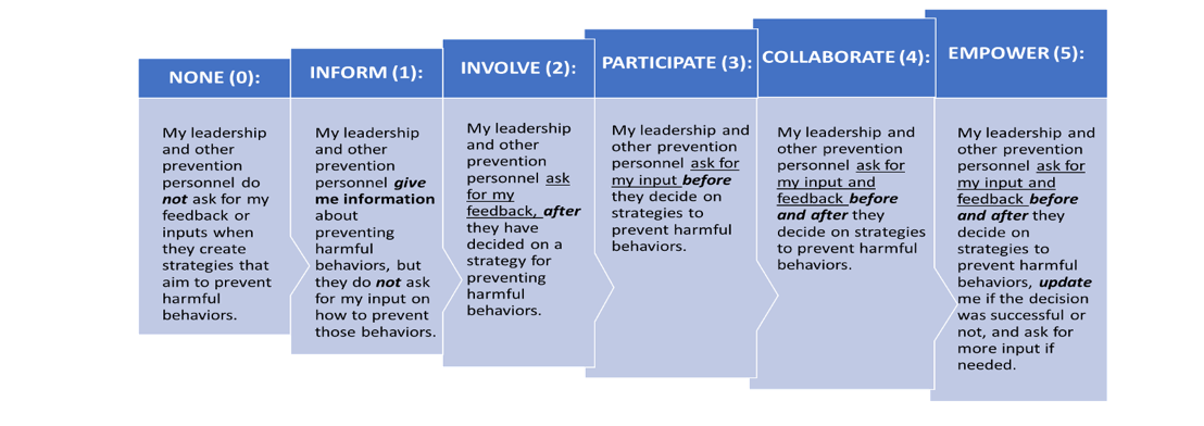 Next, we’re going to ask some questions about what prevention efforts are underway here. Prevention includes stopping self-directed and other-directed harms BEFORE they occur or, in other words, getting out in front of potential problems. In responding, be sure to include ways that your leadership aids in preventing negative behaviors. [INTERVIEWERS: Give them a couple of seconds to process the question.]