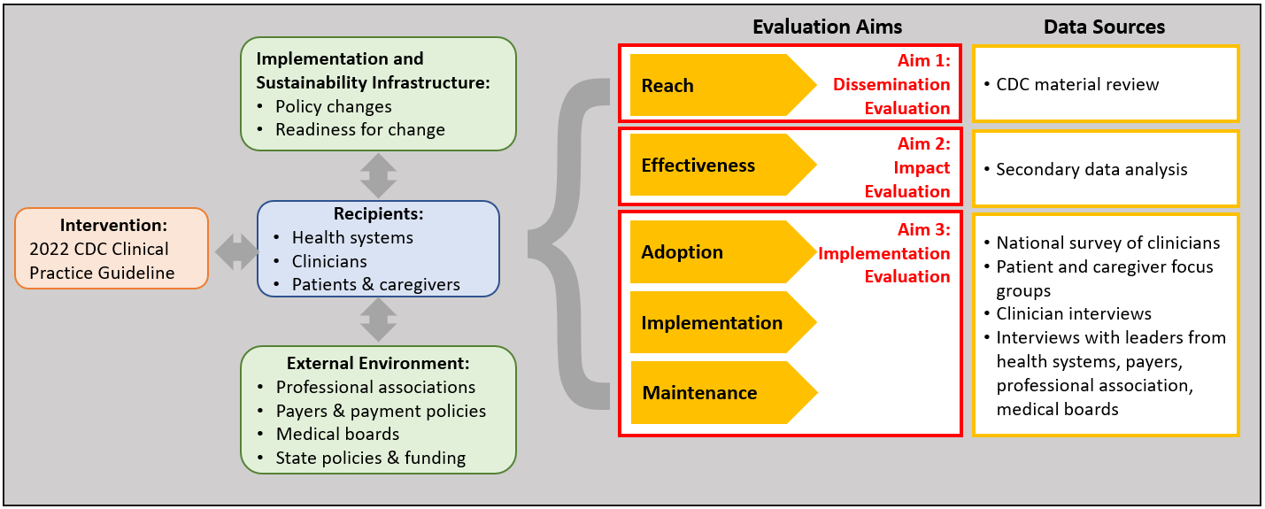 In Exhibit 1, we have specified the “intervention” as the release of the 2022 CDC Clinical Practice Guideline, and “recipients” as health systems, clinicians, patients, and caregivers. We have hypothesized potential factors that may affect the implementation and sustainability within a clinical setting, such as changes in health systems or others’ policies and the readiness of clinicians or health systems for change. Finally, we outline examples of contextual factors from the external environment, including engaging leaders from health systems, payers, professional associations, and medical boards; and exploring state policies and funding. The RE-AIM outcome measures map onto the three aims of the evaluation: first, to evaluate the reach of disseminating the 2022 CDC Clinical Practice Guideline; second, to evaluate its effectiveness in terms of measurable impacts; and third, to measure its adoption, implementation, and maintenance. Exhibit 1 also includes proposed data sources that the project team will use to examine the evaluation aims.