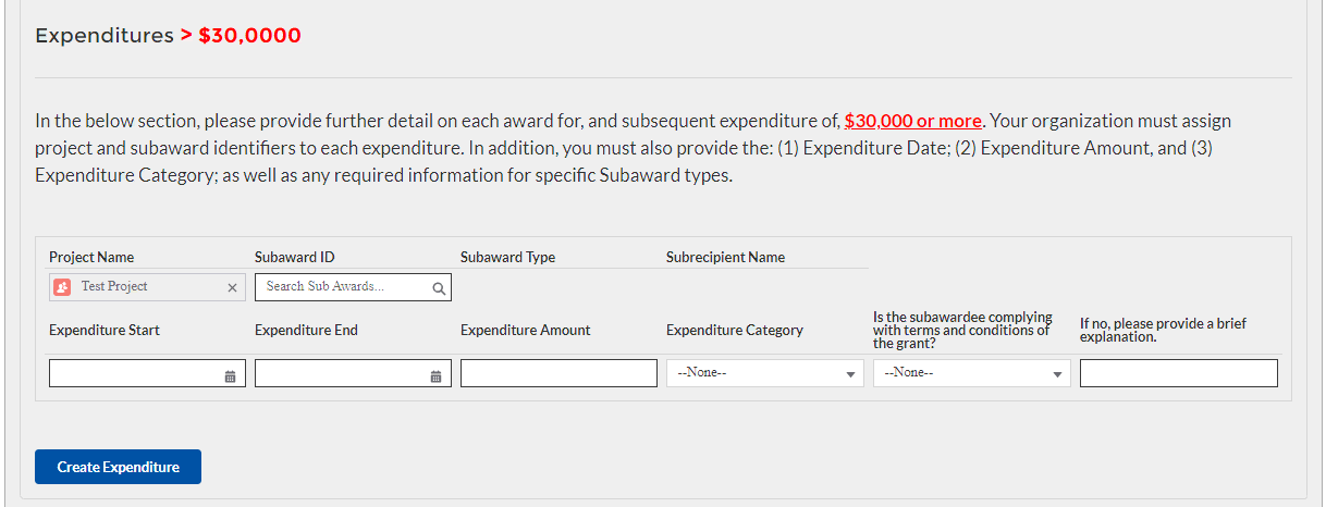 Once Subaward data is entered, you will need to provide information regarding the expenditure of Subawards. The expenditures will be categorized into three groups: (1) Expenditures greater than or equal to $30K, (2) Aggregated Expenditures less than $30K, (3) Aggregated Expenditures to individuals less than $30K.