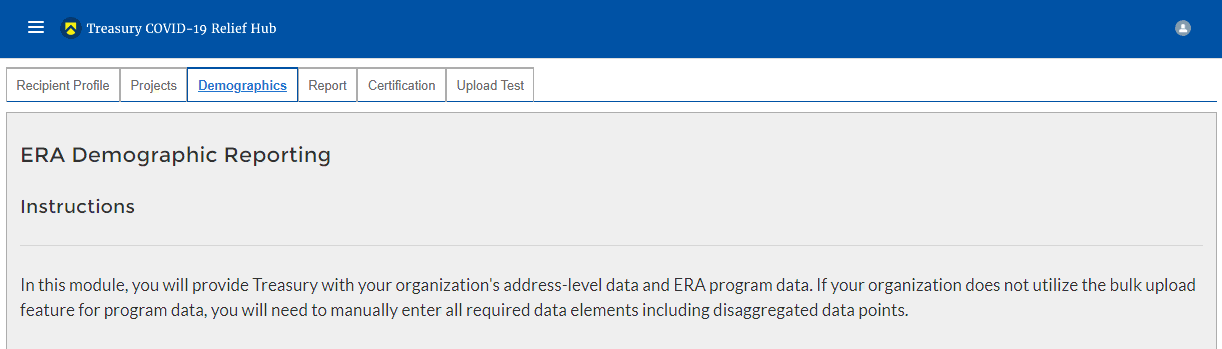 After completing the Subaward Reporting, the Subrecipient Profile Submodule will document the information of Subrecipients that received federal funding from the ERA program. You can enter each Subrecipient record individually or utilize a bulk-upload feature.