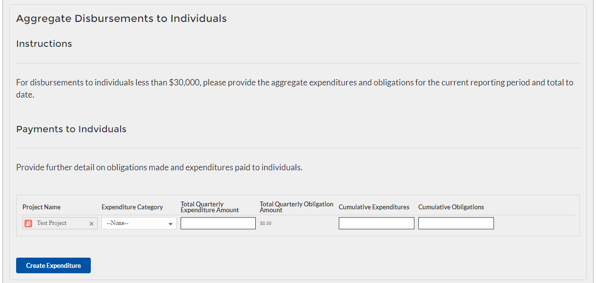 You will have the ability to individually enter expenditures or utilize a Subaward Expenditure Bulk Upload feature.
