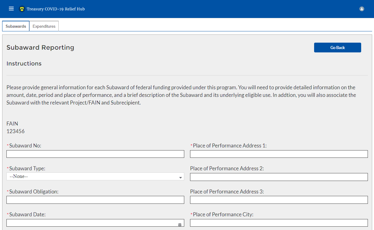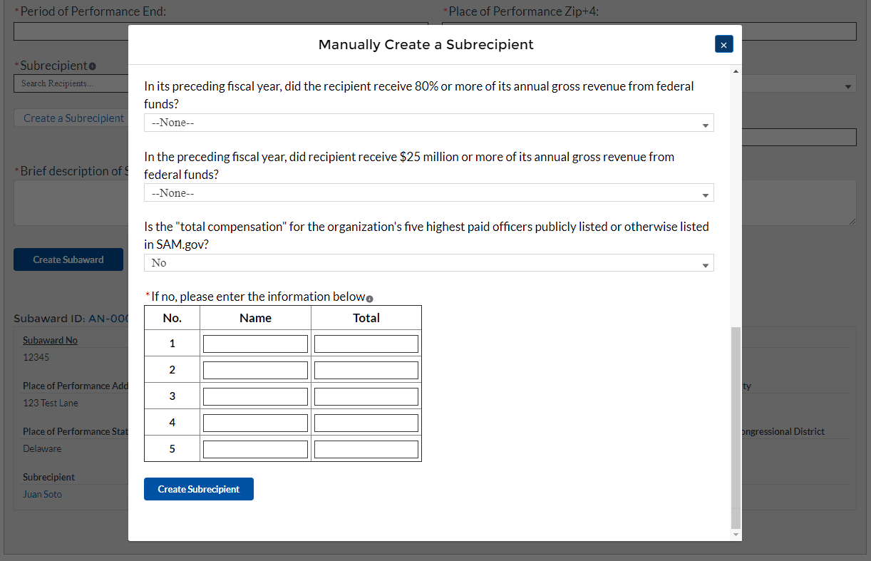 Enter the relevant Subrecipient information below in each of the required fields.