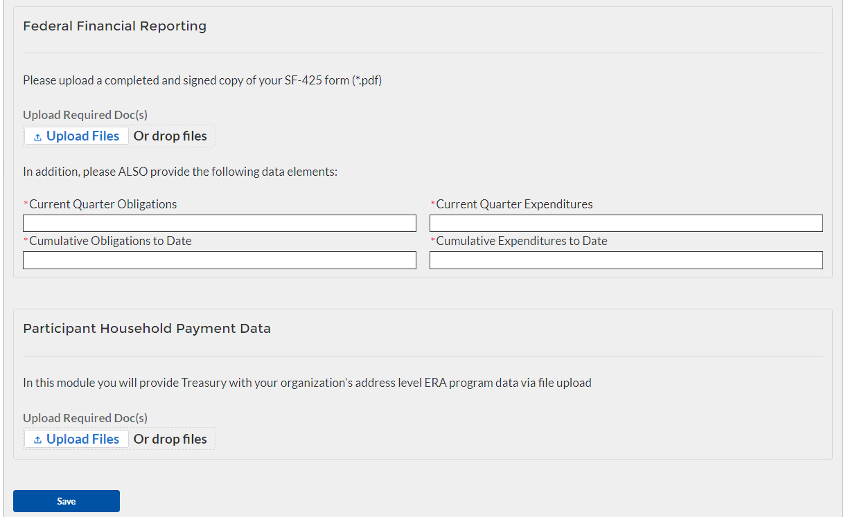 In this Module, each State, Local and Territorial Recipient must submit a data file containing the household-level information described below for each ERA assistance payment made to or on behalf of each participant household during the reporting period. The Financial Assistance expenditure category includes payments made by State, Local or Territorial Recipients and by all subrecipients and contractors for rent, rental arrears, utility/home energy services, utility/home energy services arrears, and other housing services and eligible expenses.