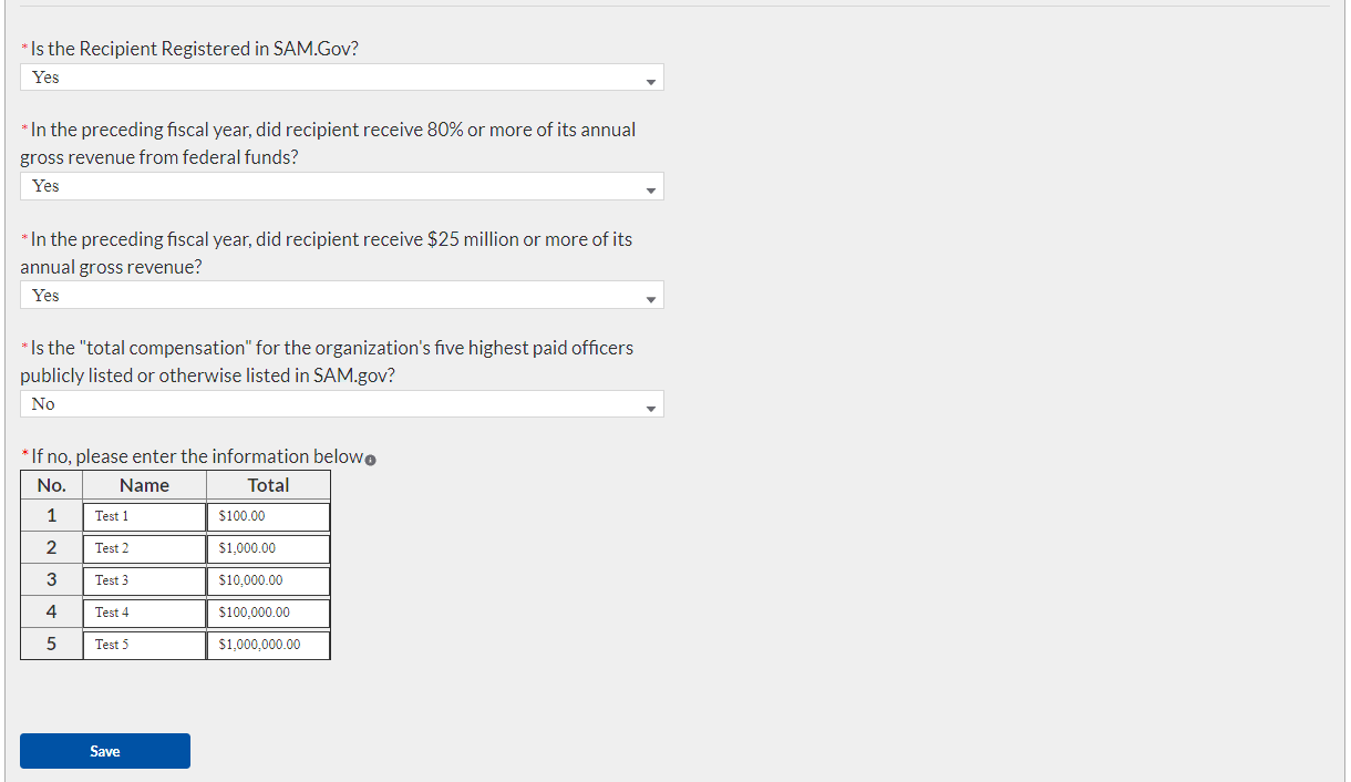 If your organization’s five highest paid officers is not publicly listed or otherwise listed in SAM.gov, enter the name and total compensation of each officer in the table shown below.