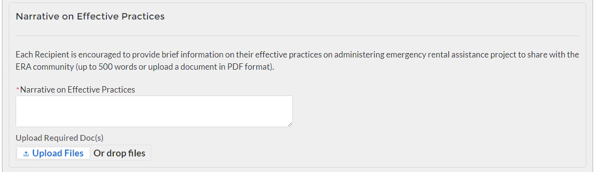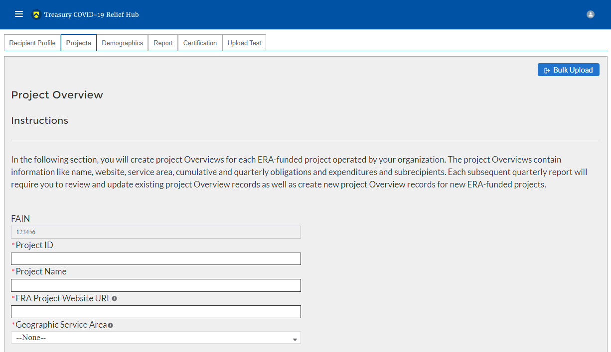 After completing the Subaward Reporting, the Subrecipient Profile Submodule will document the information of Subrecipients that received federal funding from the ERA program. You can enter each Subrecipient record individually or utilize a bulk-upload feature.