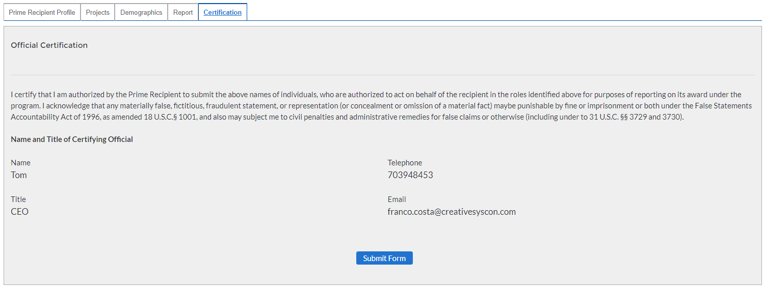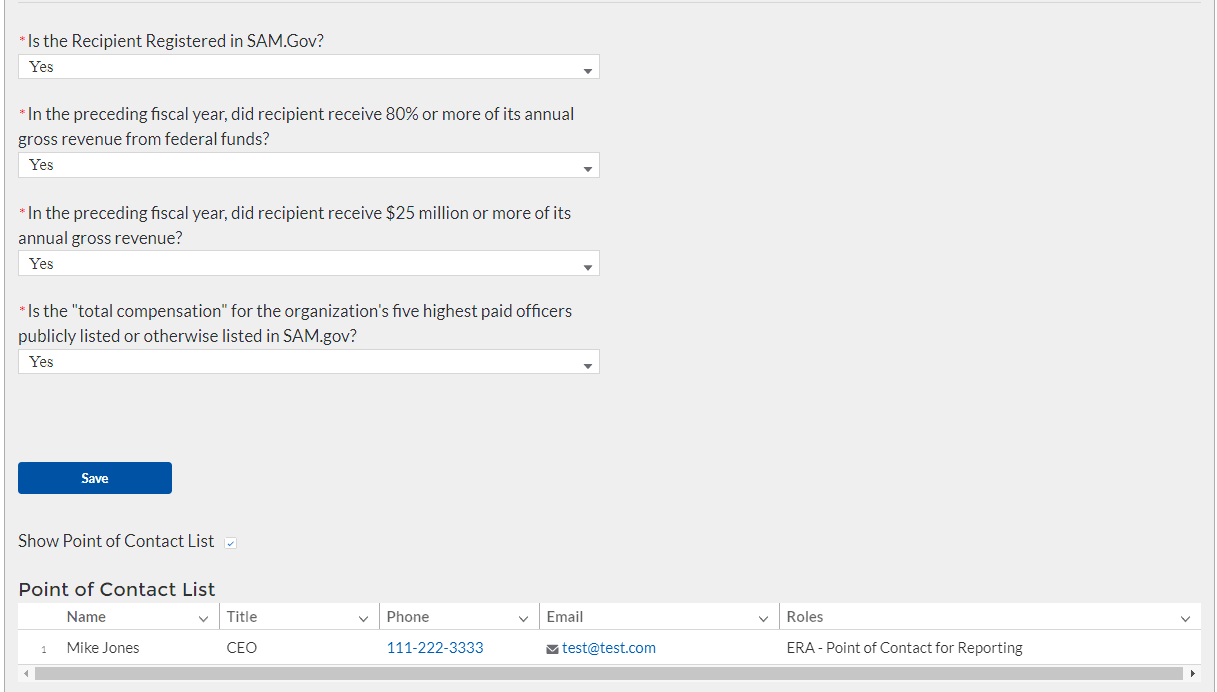 Note: This information is required for Treasury to complete the FSRS.gov reporting on your behalf.