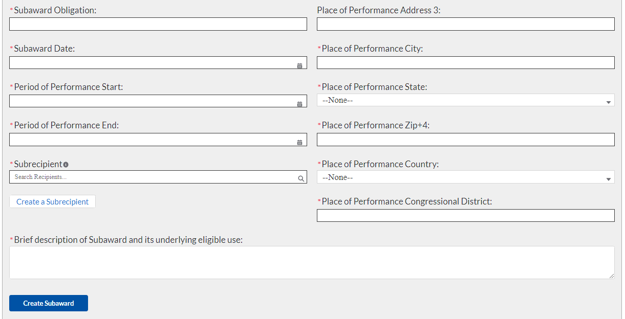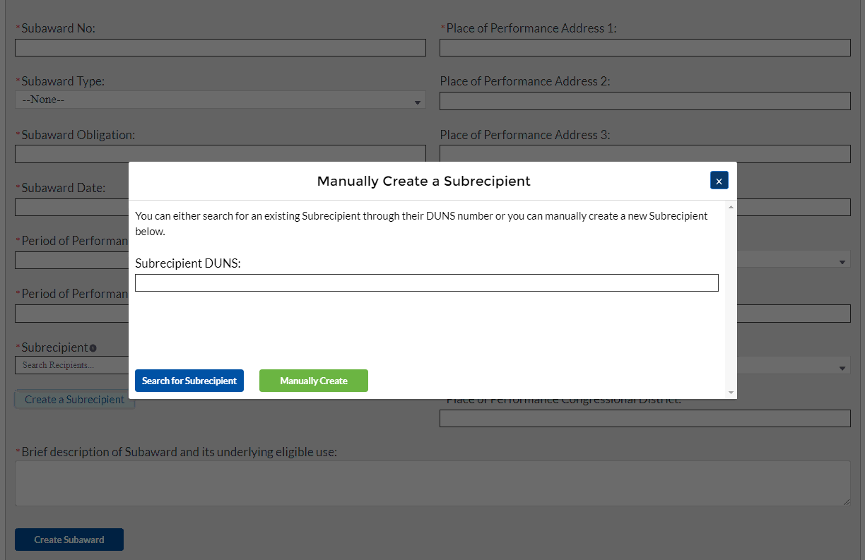 Manually enter the following fields pertaining to the Subawards: Subaward Number, Subaward Obligation, Subaward Date, Period of Performance Start, Period of Performance End, Place of Performance Address, City, State, Zip+4, Country, and Congressional District.
