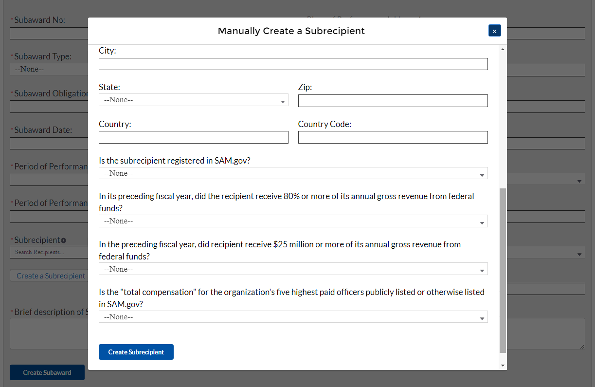 Enter the relevant Subrecipient information below in each of the required fields.