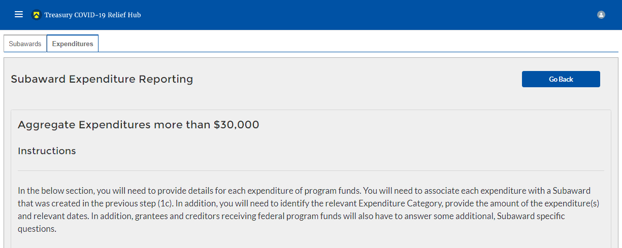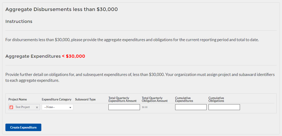 Once Subaward data is entered, you will need to provide information regarding the expenditure of Subawards. The expenditures will be categorized into three groups: (1) Expenditures greater than or equal to $30K, (2) Aggregated Expenditures less than $30K, (3) Aggregated Expenditures to individuals less than $30K.