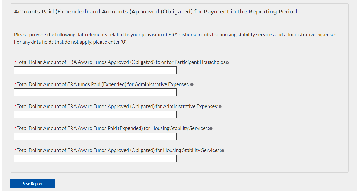 In this Module, each State, Local and Territorial Recipient must submit a data file containing the household-level information described below for each ERA assistance payment made to or on behalf of each participant household during the reporting period. The Financial Assistance expenditure category includes payments made by State, Local or Territorial Recipients and by all subrecipients and contractors for rent, rental arrears, utility/home energy services, utility/home energy services arrears, and other housing services and eligible expenses.