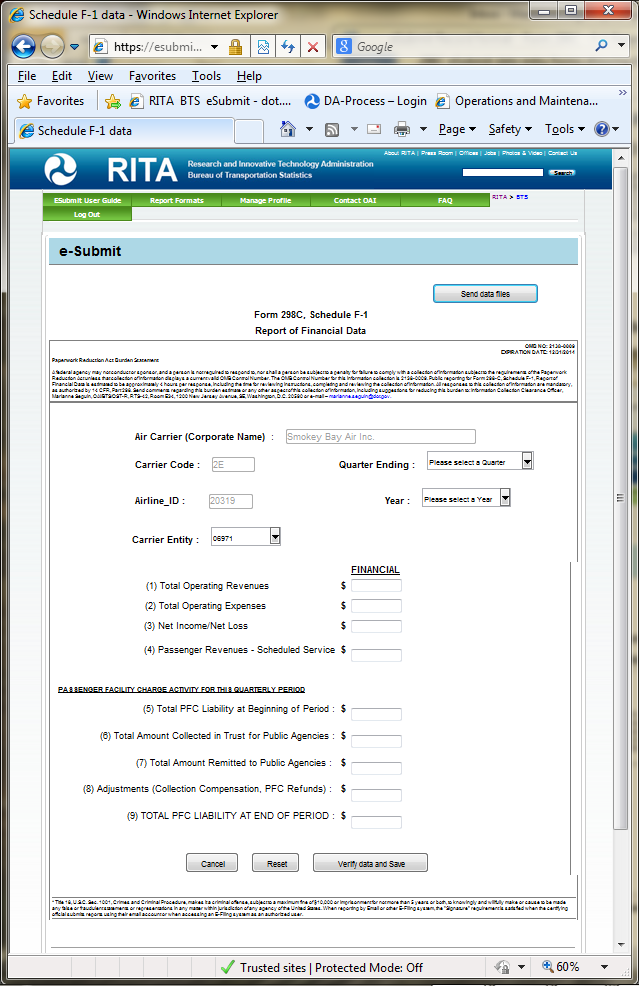 A federal agency may not conduct or sponsor, and a person is not required to respond to, nor shall a person be subject to a penalty for failure to comply with a collection of information subject to the requirements of the Paperwork Reduction Act unless that collection of information displays a current valid OMB Control Number. The OMB Control Number for this information collection is 2138-0009. Public reporting for Form 298-C, Schedule F-1, Report of Financial Data is estimated to be approximately 4 hours per response, including the time for reviewing instructions, completing and reviewing the collection of information. All responses to this collection of information are mandatory, as authorized by 14 CFR, Part 298. Send comments regarding this burden estimate or any other aspect of this collection of information, including suggestions for reducing this burden to: Information Collection Clearance Officer, Marianne Seguin, OAI/BTS/OST-R, RTS-42, Room E34, 1200 New Jersey Avenue, SE, Washington, D.C. 20590 or e-mail –