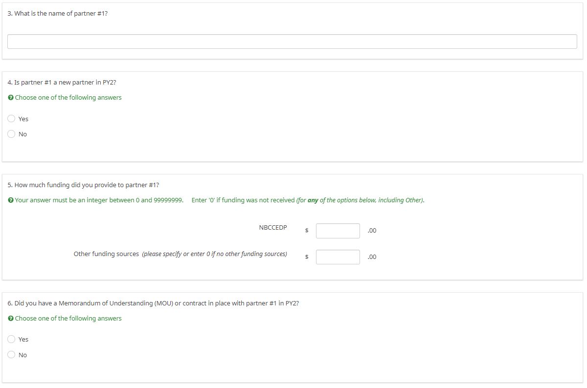 The following five questions will be asked for each of the partners specified in question #2.