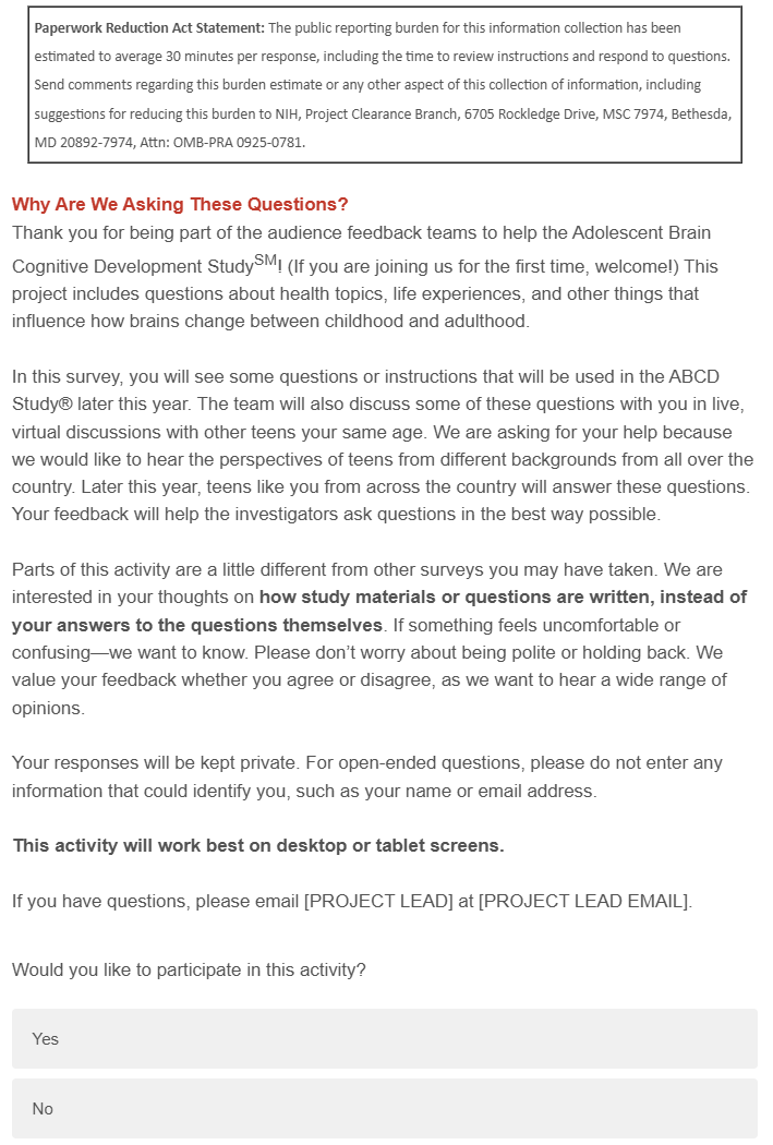 ABCD Study Audience Feedback Teams OMB #0925-0781 | Expiration 11/30/2027