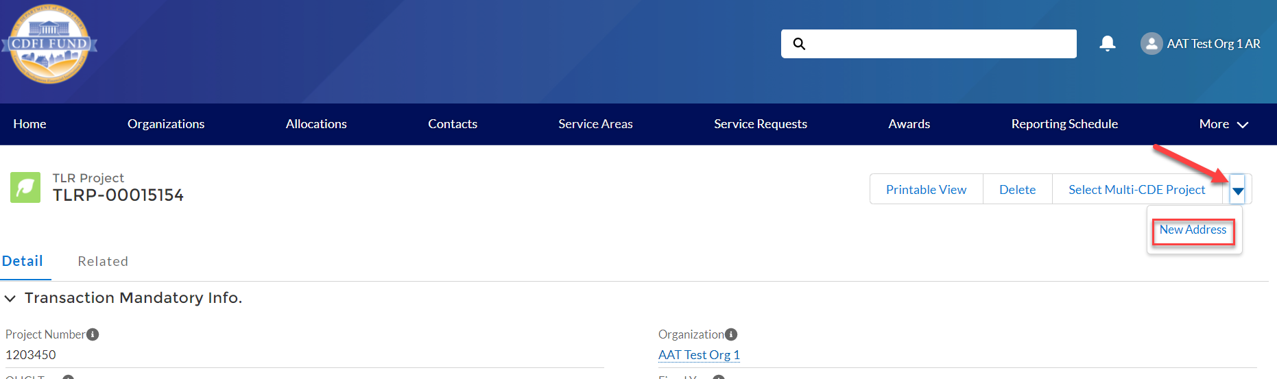 Once you have completed and saved your Loan Source record, click on the TLR Projects Tab again, click on the new record you created and then click on the “New Address” button. Fill out the information based on the Data Points listed in the guide.