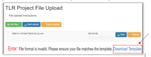 If the uploaded file is in the wrong format or uses an outdated template, AMIS will automatically generate an error message and provide the user with the correct template. Click on “Download Template,” transfer TLR data on to the new template and resume the upload process.