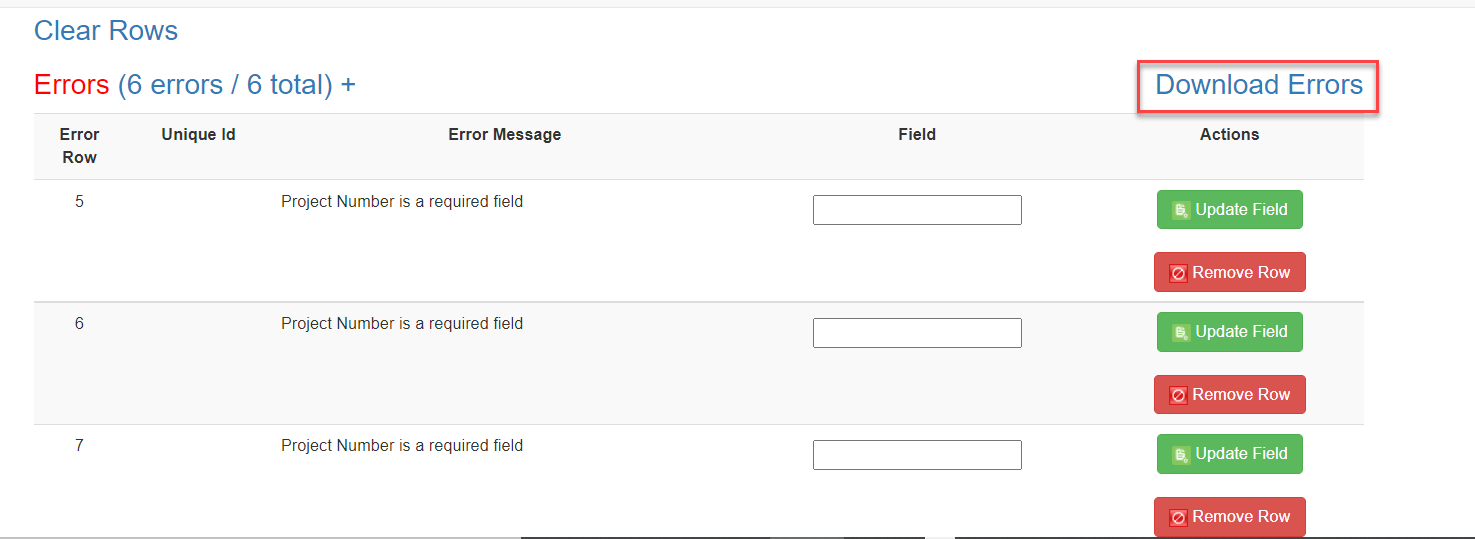 Alternatively, users can fix errors in their upload data by clicking “Download Errors” and downloading a file containing uploaded data and corresponding error message. The error file can be used to make changes in the original upload file.