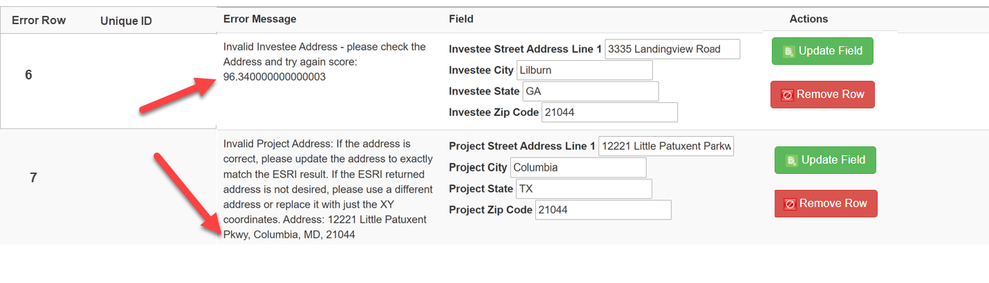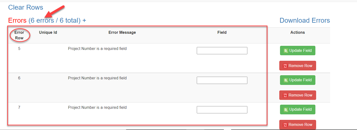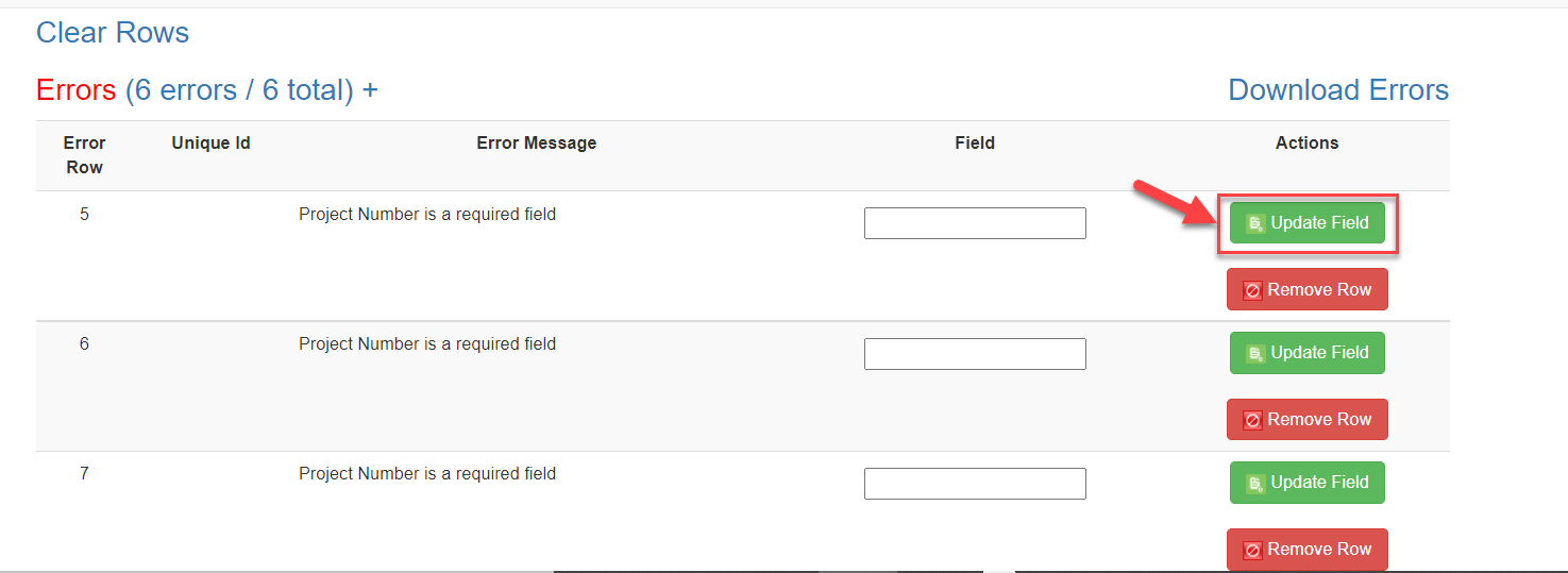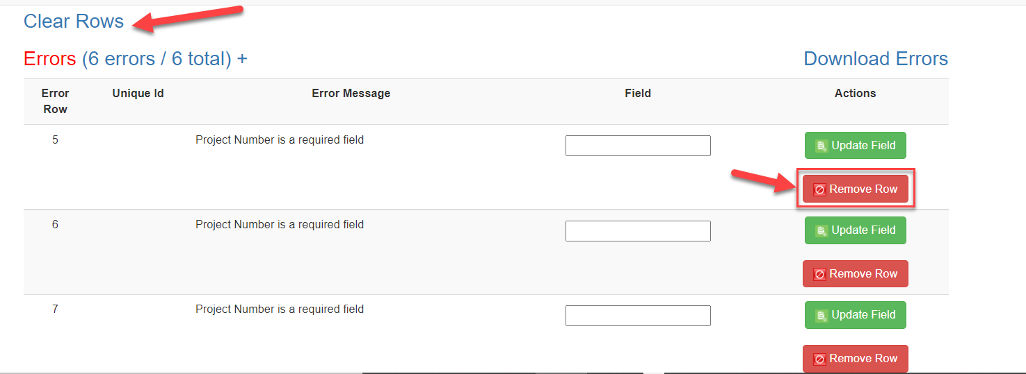 If the user decides not to upload a specific row, the row may be removed by clicking the red “Remove Row” button. If the user decides not to upload any of the rows, all rows may be removed by clicking “Clear Rows.”