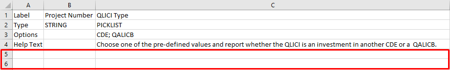 Use row 5 and on in the CSV file to fill out your answers for the labels (fields) in row 1.