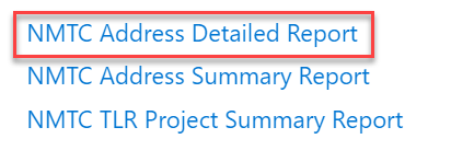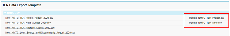 Search for the organization you are associated with and download the two update templates called Update_NMTC_TLR_Project.csv and Update_NMTC_TLR_Note.csv.