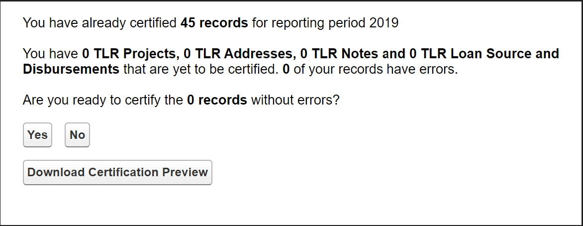Starting August 2020, users have the option to certify data when the data is available -- prior to the reporting due date -- by using the “Interim Certification” button. Once all TLR records for a fiscal year are Interim Certified, users are required to close out the certification window for that fiscal by using the “Final Certification” button.