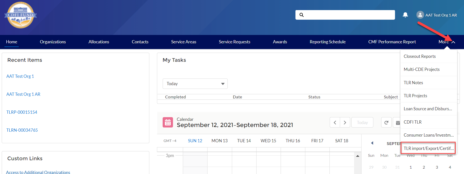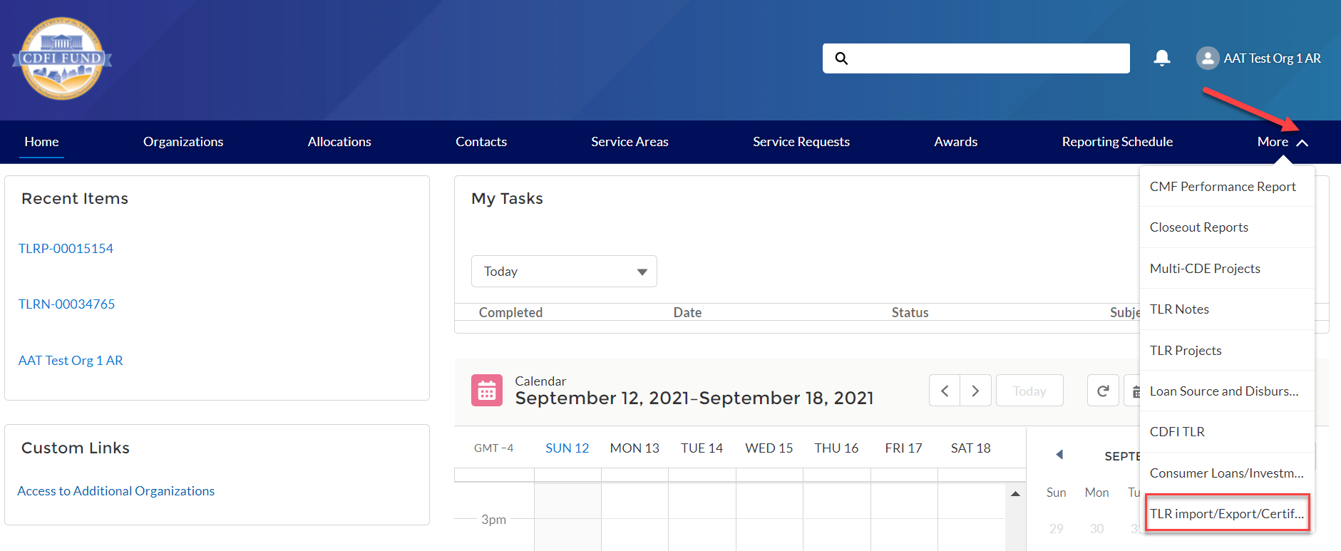To create multiple TLR records at one time, AMIS allows users to upload files using an XML schema. To get started click on the "TLR Import/Export/Certify" tab located in the “More” dropdown.