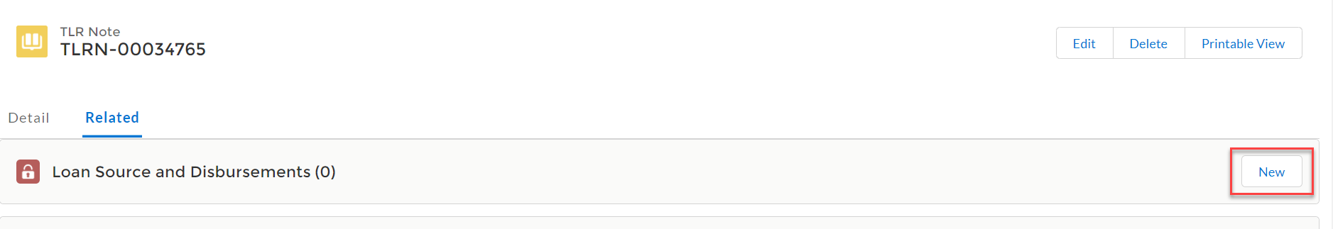 Once you have finished filling out and saving your TLR Note record, scroll down the page to the Loan Source and Disbursements related list (located on the TLR Note record – Related Tab). Click the “New” button. Fill out the information based on the Data Points listed in the guide.