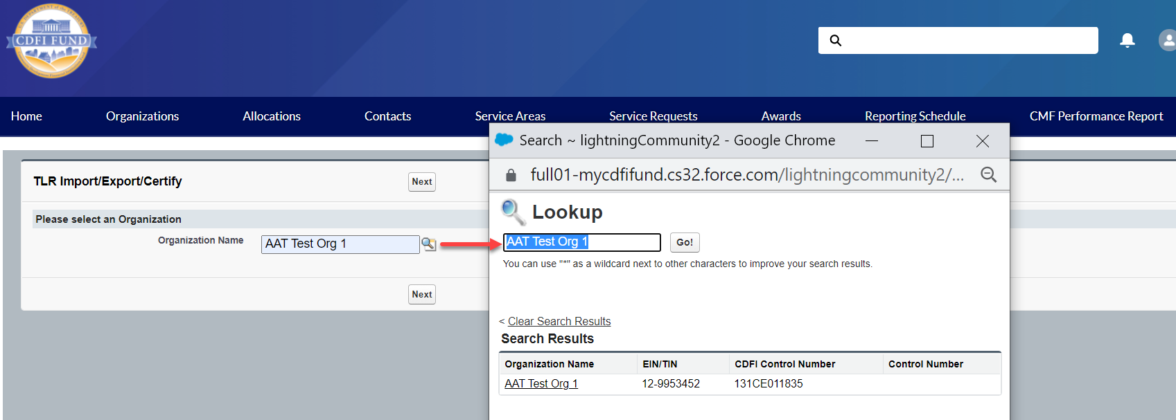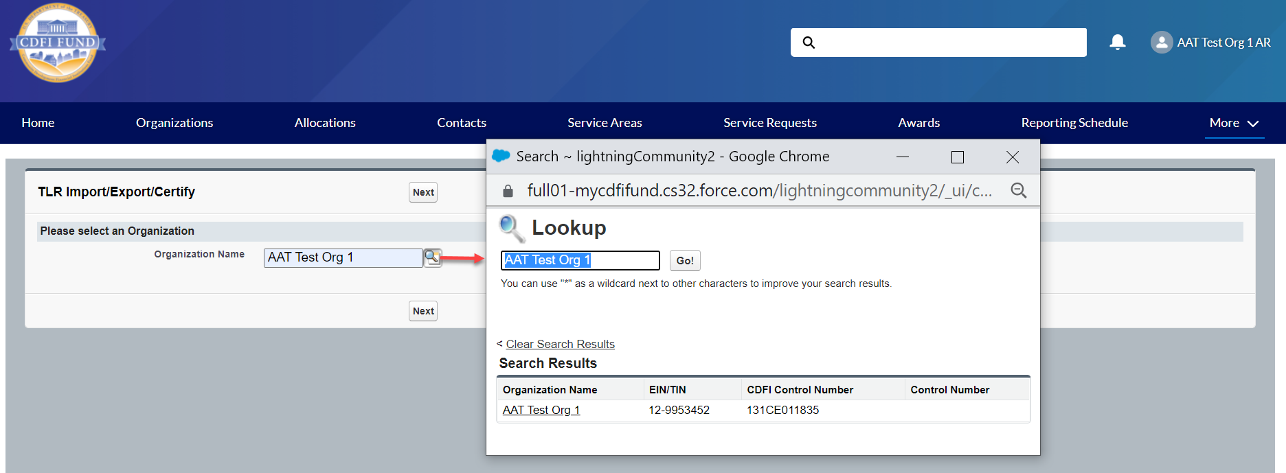 Use the "Organization Name" field to enter the name of the organization for which you are submitting TLR records. You may also select the Organization Name from a list by clicking on the search icon next to the “Organization Name” field and choosing from a list of organizations you are permitted to access.