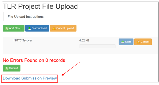 Once all the incorrect entries have been fixed and the data is uploaded again, users will see a message indicating that no errors were found. To view a file containing all the data that will be successfully uploaded into AMIS, users can click on “Download Submission Preview.”