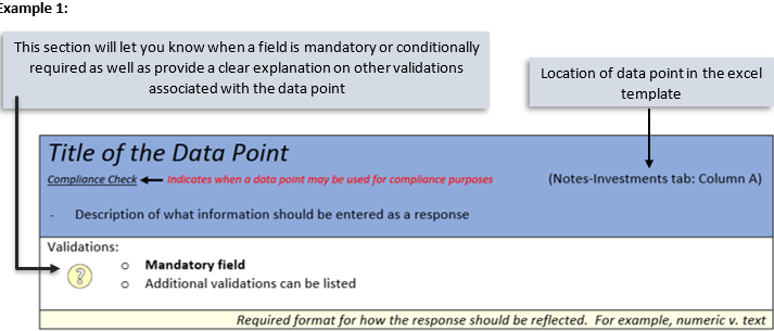 Project Number (Column B) Compliance Check Report the project number for each address that was previously input in Project Number column on the Notes-Investment tab: Column A. |