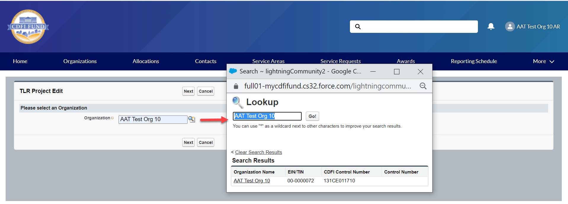 Use the "Organization Name" field to enter the organization’s name to create the TLR records. Click the search icon to see a list of the organizations to which you are associated.