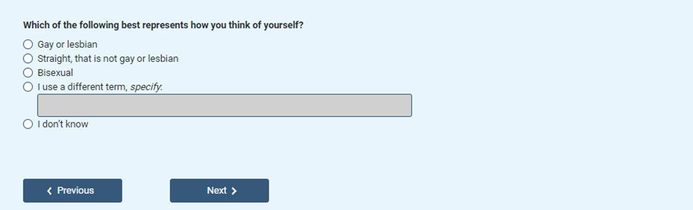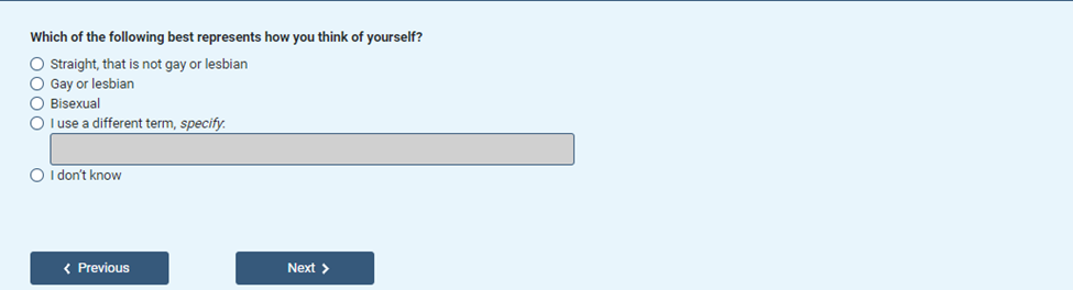When conducting our analyses, survey users were the universe of interest for all paradata metrics: changed answer rates, “Previous” click rates, and breakoff rates. Base weights were used for the paradata analysis. Survey respondents were the universe of interest for the item nonresponse analysis and response distributions. Final weights were used for this part of the analysis. Additionally, the response distributions for survey items (excluding the probing questions) come from edited and imputed data; if a respondent left a question blank, a value was imputed for them and the imputed value was used in the response distribution tables.3 Item nonresponse rates in Section 4 show the extent to which gender identity and sexual orientation were imputed.