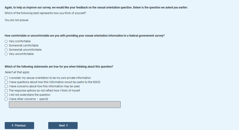 Additionally, to further measure respondent attitudes and comfort answering these questions, four question probes were added in the Bridge Panel: two for gender identity and two for sexual orientation.