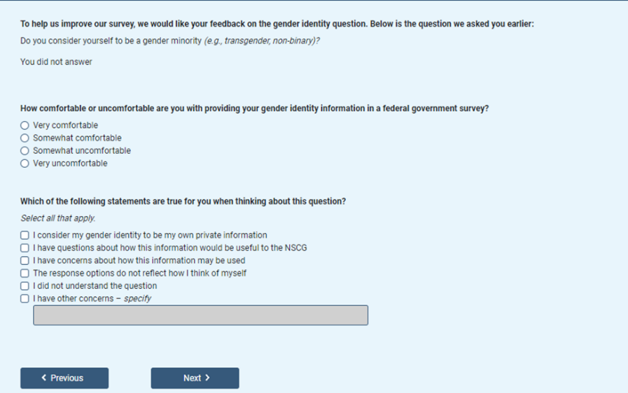 5 An excerpt from the 2021 National Survey of College Graduates Bridge Panel Analysis Results document: “A recent report released by the National Academies of Sciences stated that, “For data collections where respondents can easily skip over items if they do not wish to answer, it is not necessary to provide an explicit “prefer not to answer” response.” (National Academies of Sciences, Engineering, and Medicine, 2022). Other national surveys with questions about gender identity are testing questions that do not include this response option (National Center for Health Statistics (U.S.), 2022; Office of Management and Budget, 2022).”