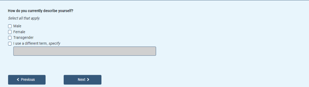 In the production instrument, the next question in the survey (SOGI2, shown in Figure 2) asked a respondent to describe their gender identity. Bridge Panel respondents were shown the alternative gender identity question (GENMIN, shown in Figure 3).