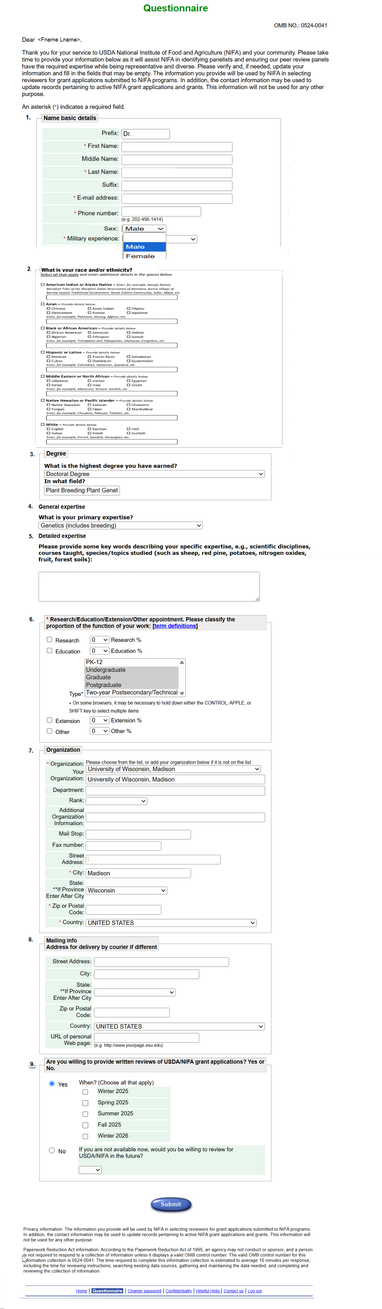 PRS Questionnaire current screen before changes to Gender, Race , Ethnicity fields: