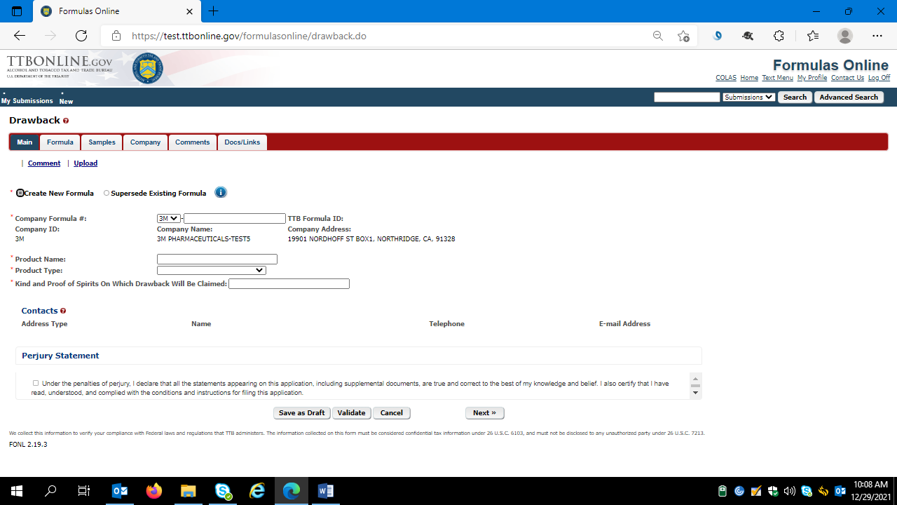 (Equivalent to TTB F 5154.1, Formula and Process for Nonbeverage Products)