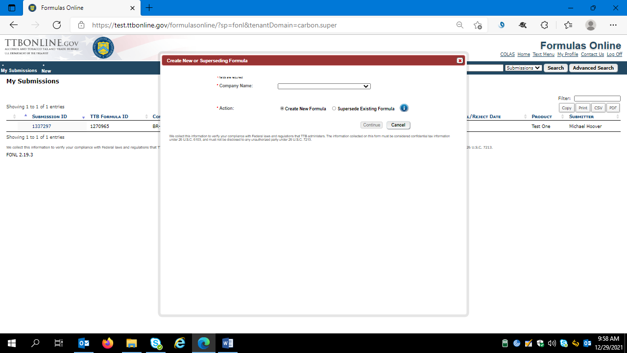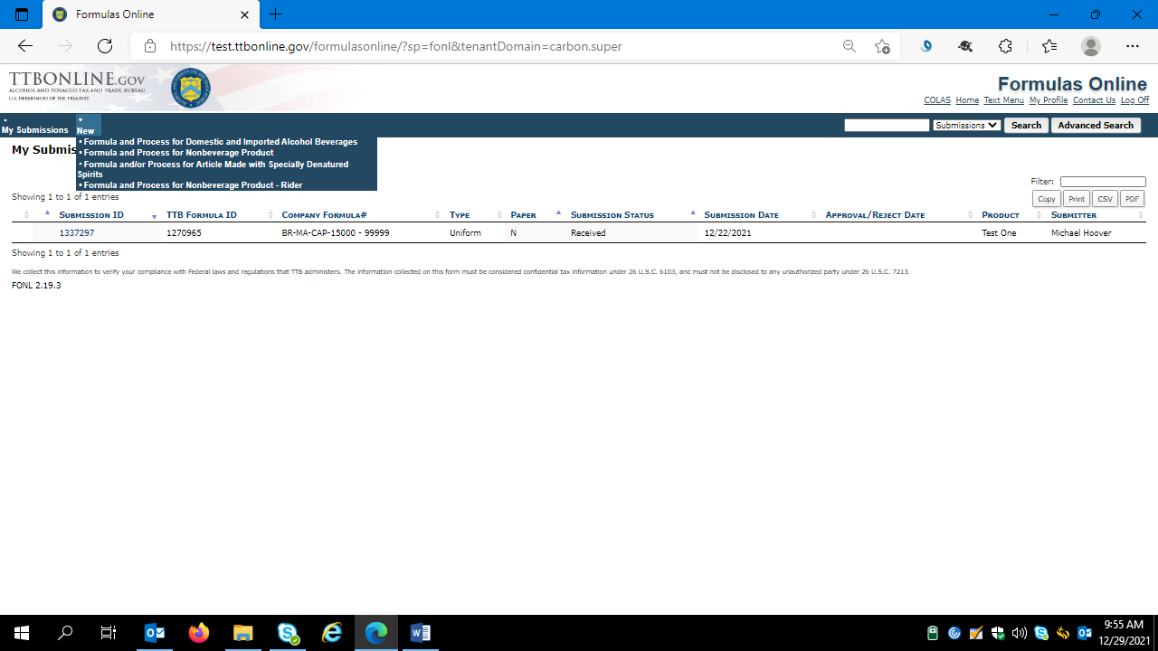 The user logs on and FONL presents the user with a screen showing their previous FONL submissions. Using the drop down menu under the “New” button, the user chooses the type of formula and process they will submit – in this case, “Formula and Process for Nonbeverage Product.”