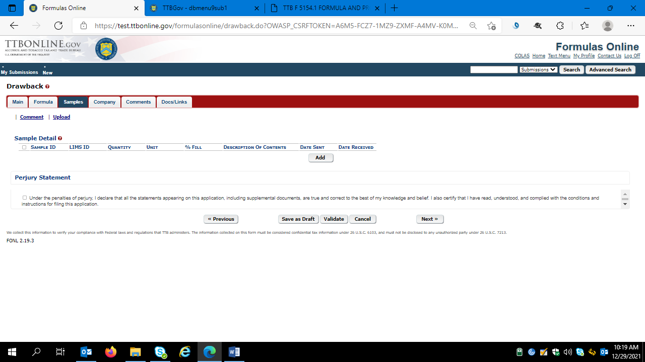 User completes the “Sample” tab if TTB requires the submission of a sample of the product in question: