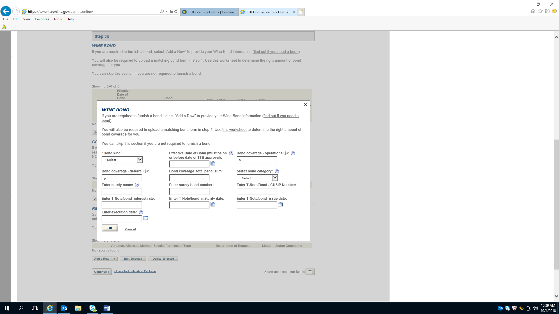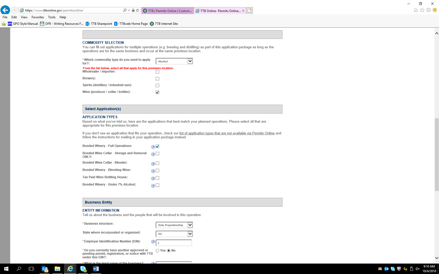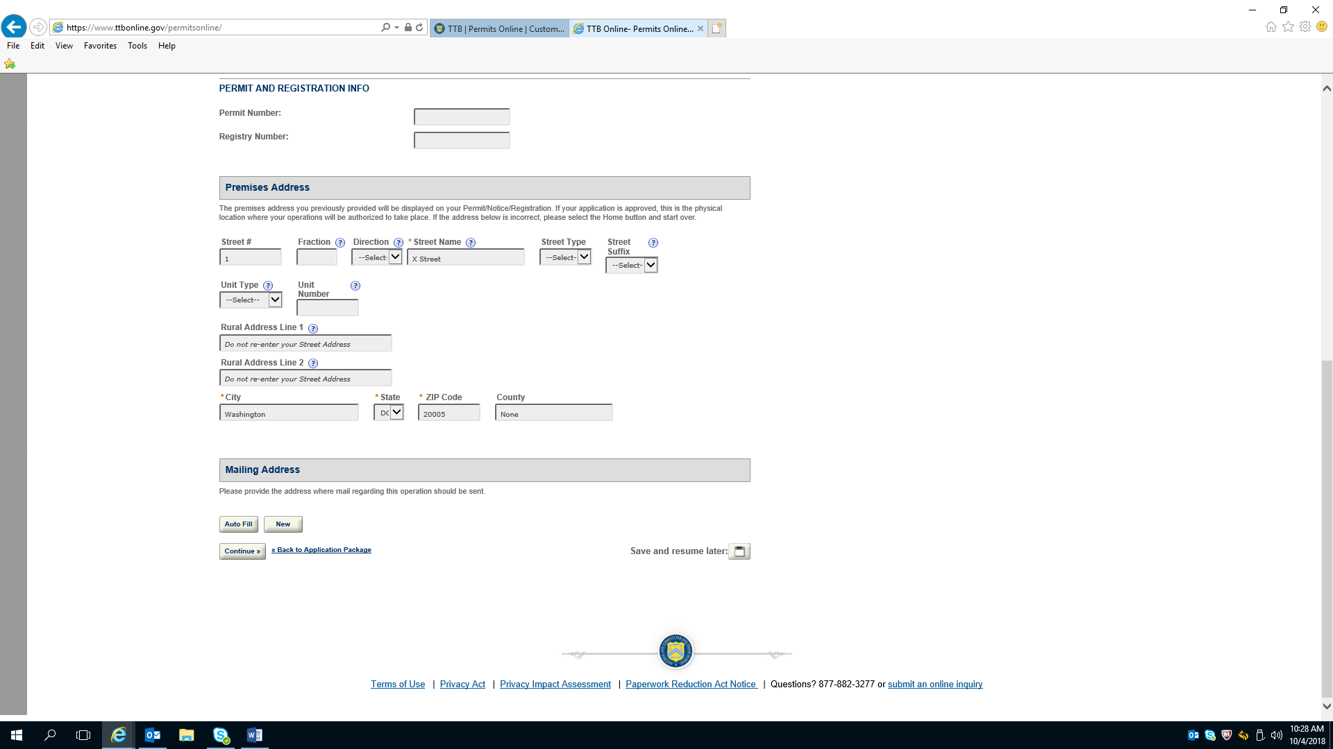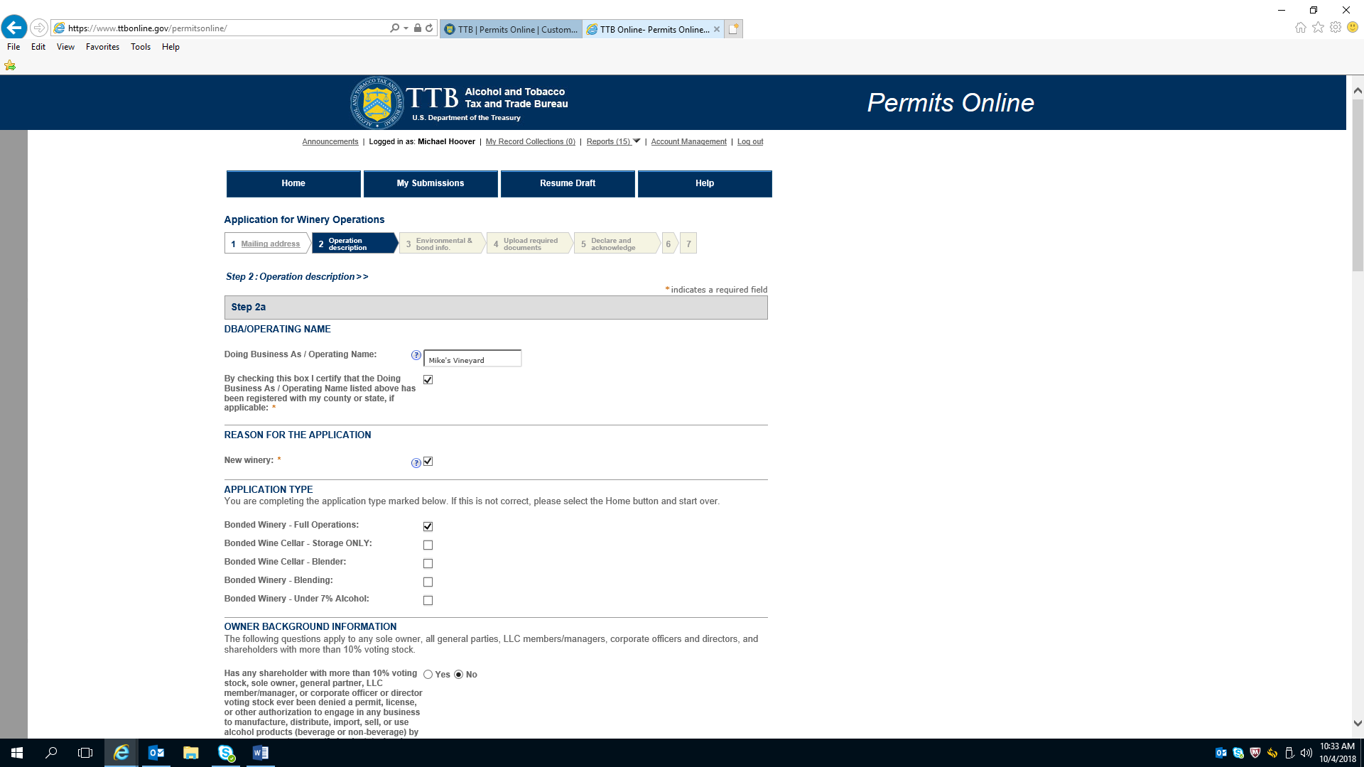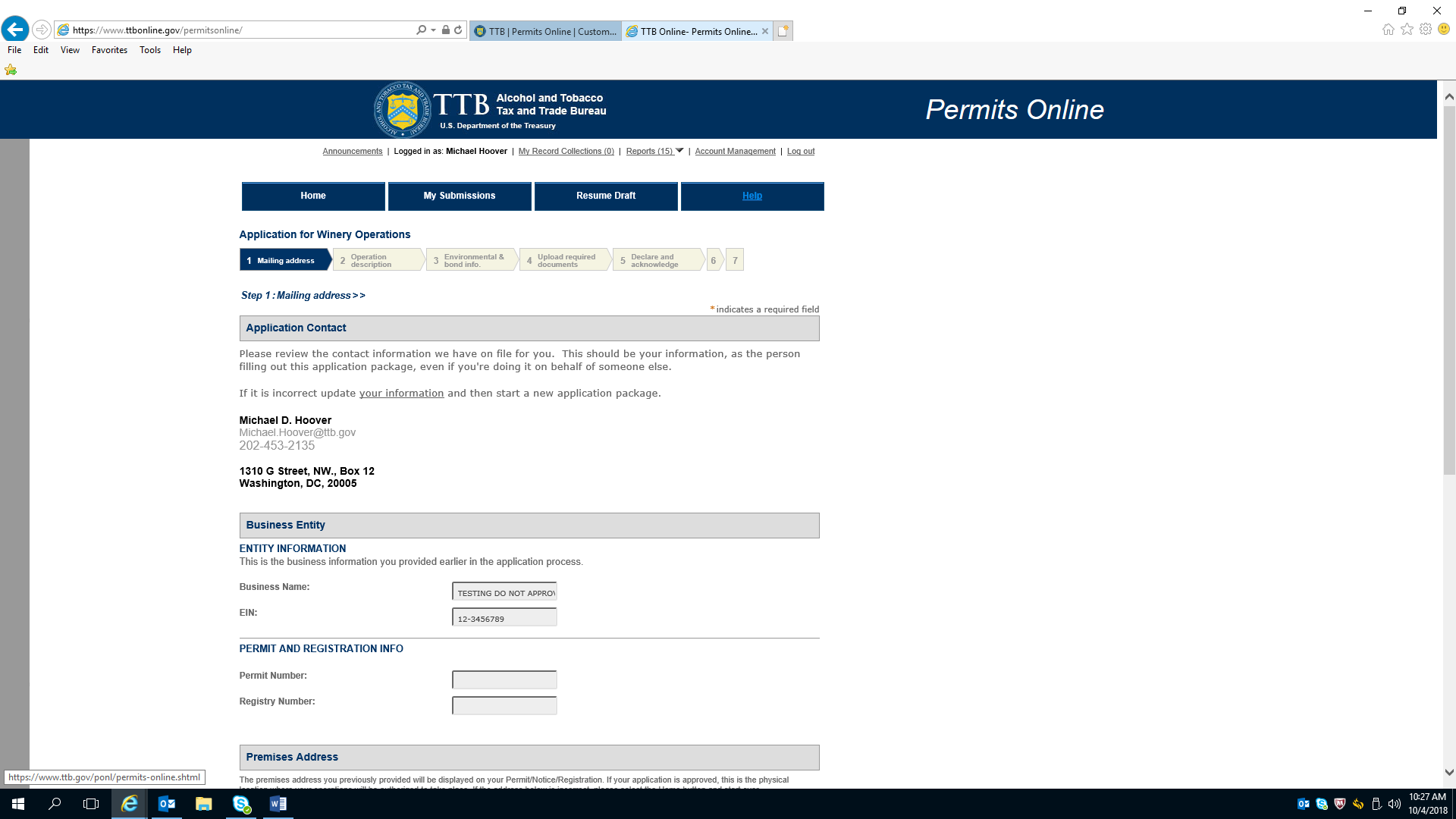 Permits Online Screen Shots — New DSP or Bonded Wine Premises FAA Act Basic Permit Applications (OMB Control No. 1513–0018) (10-2018)