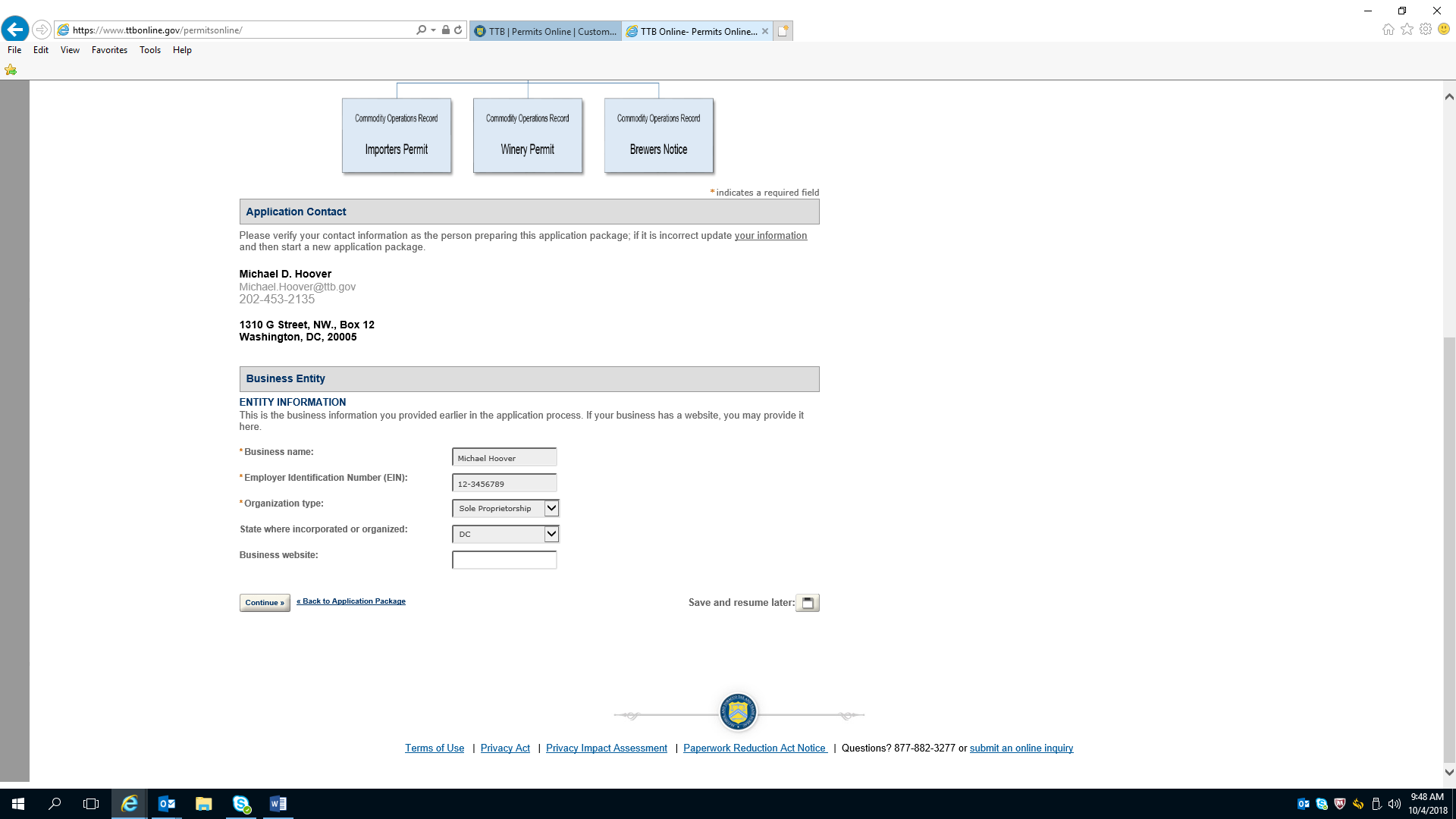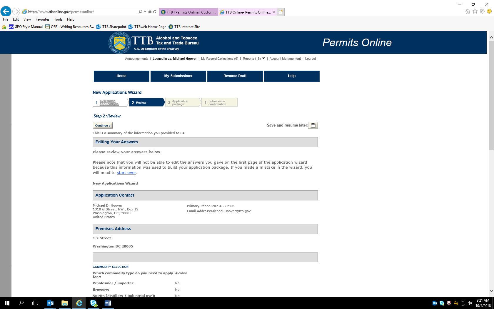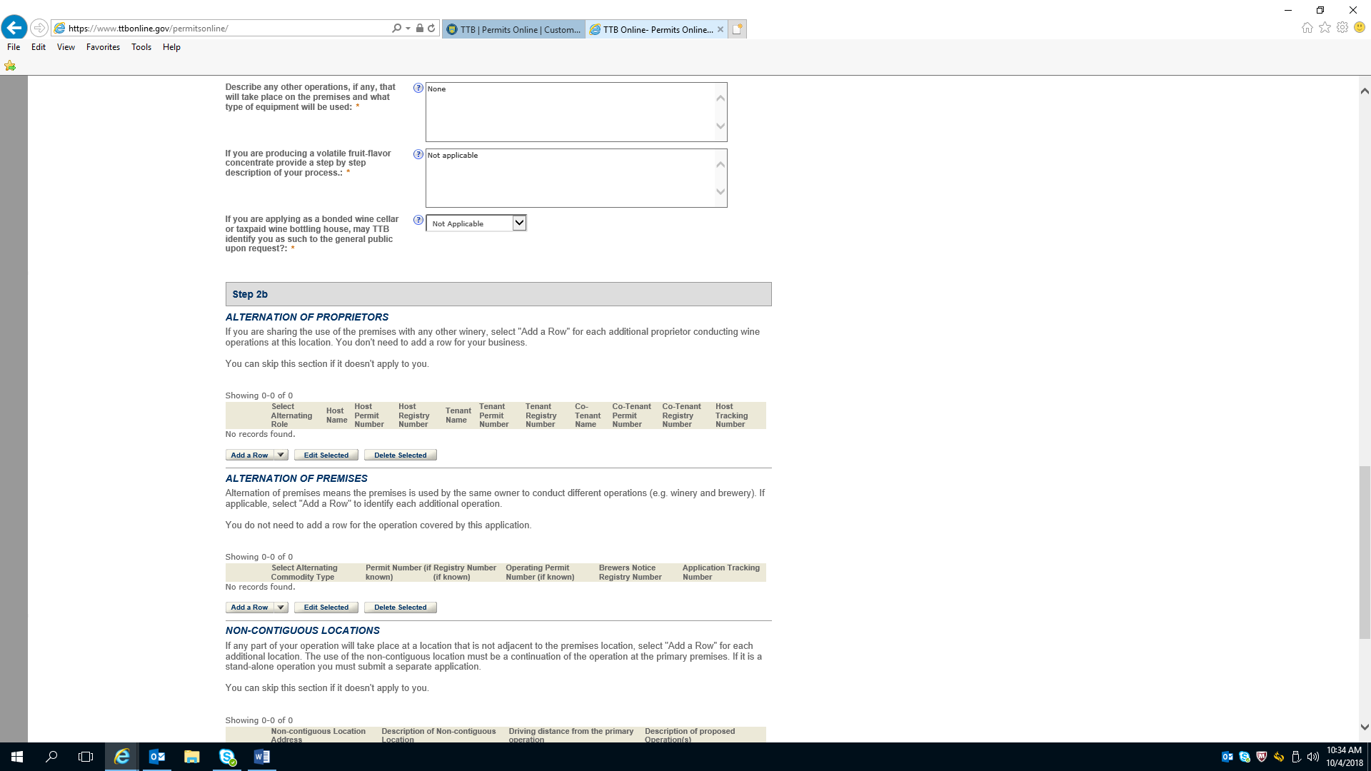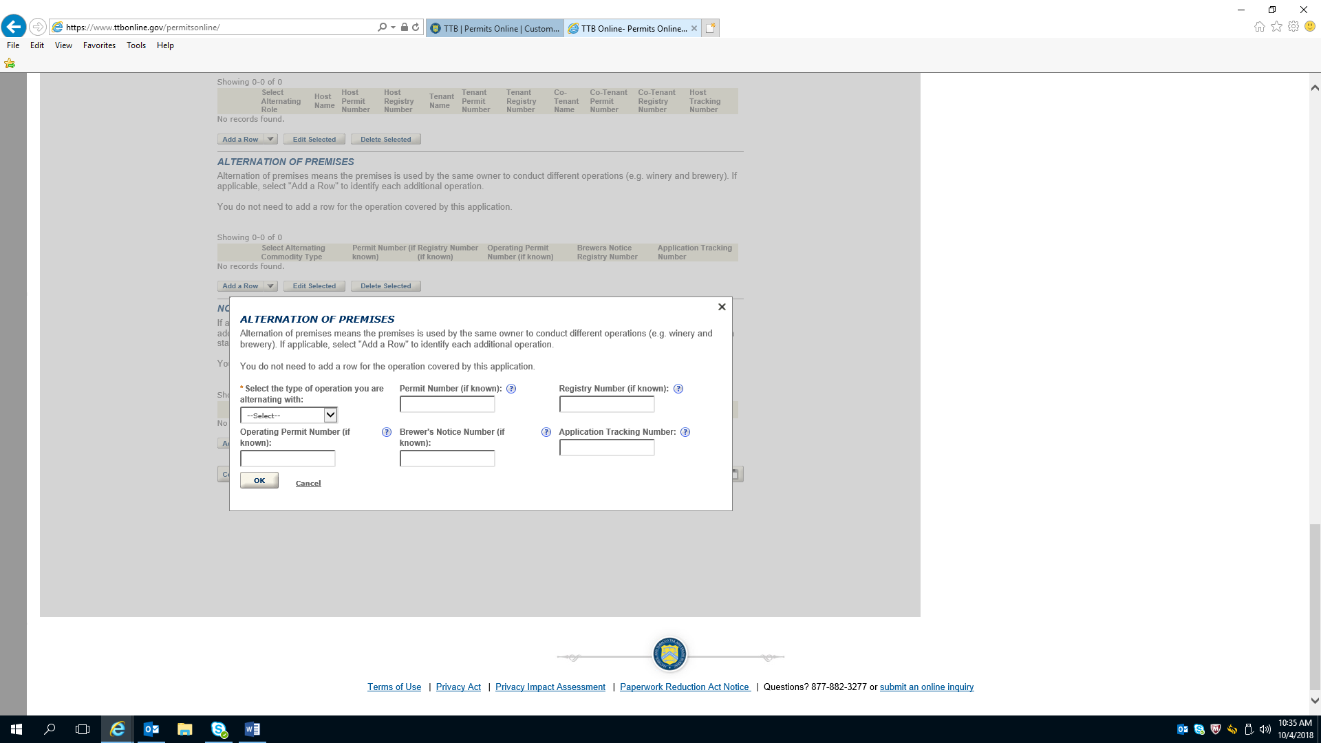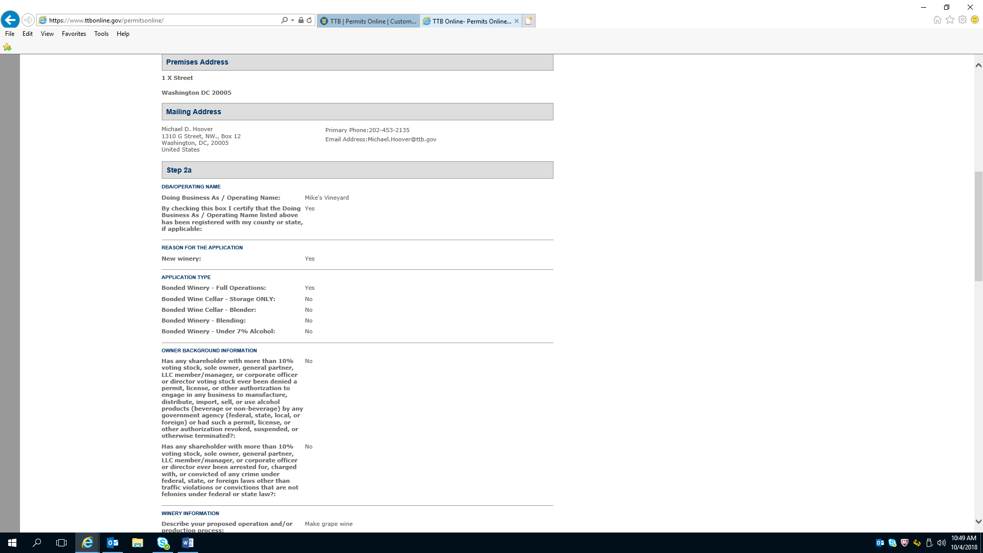 Permits Online Screen Shots — New DSP or Bonded Wine Premises FAA Act Basic Permit Applications (OMB Control No. 1513–0018) (10-2018)