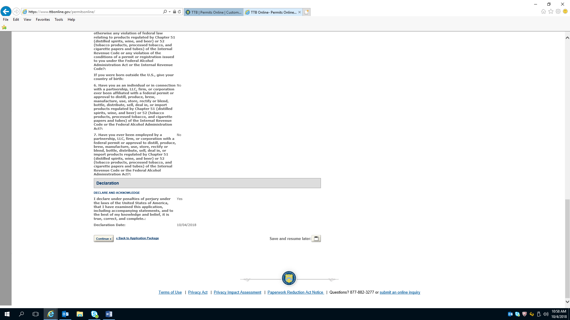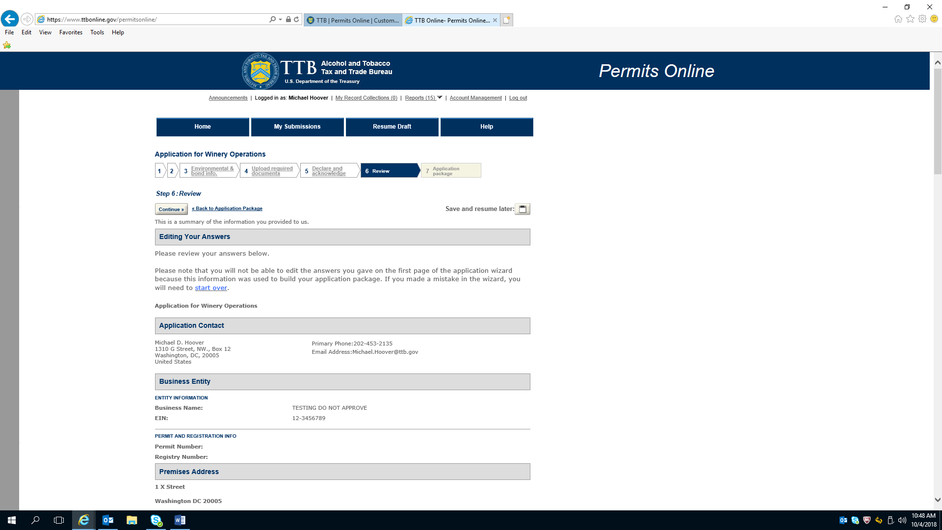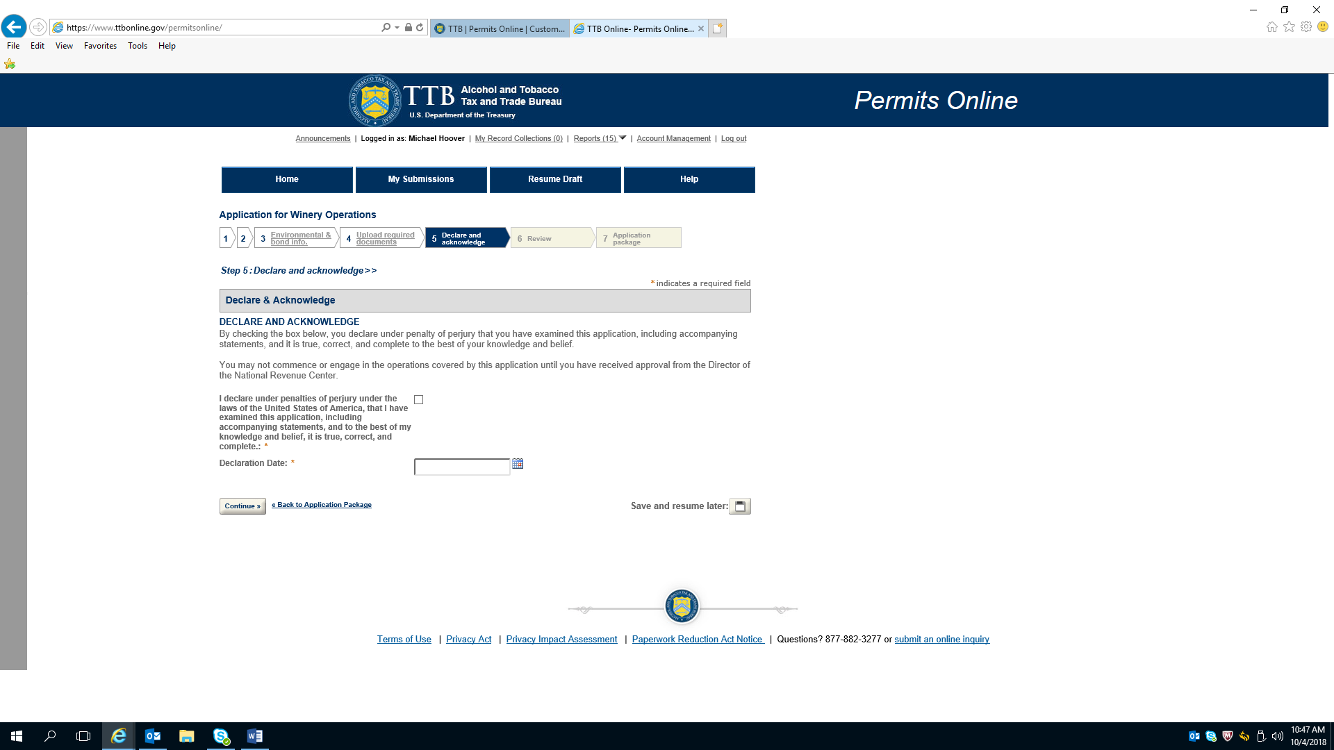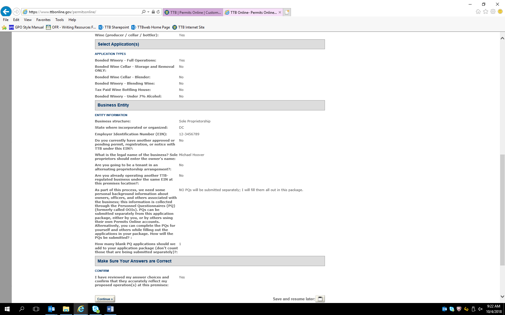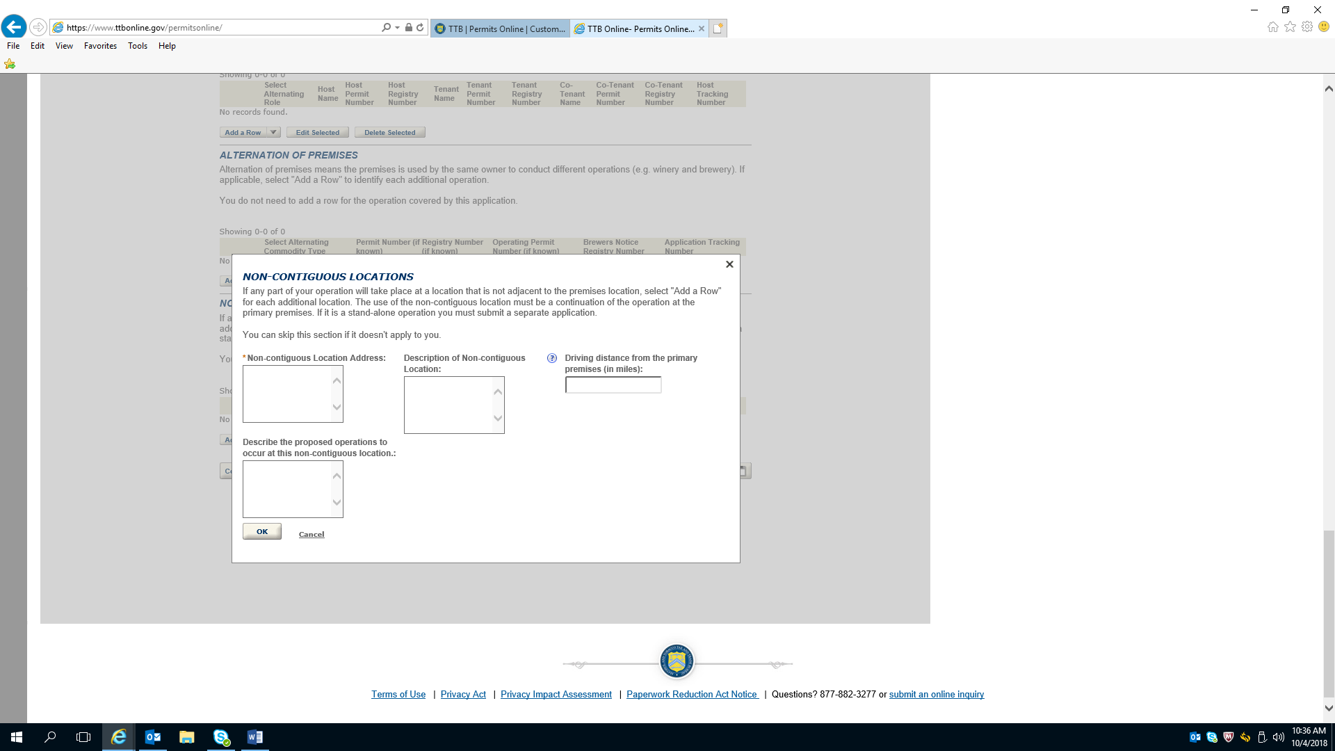 Permits Online Screen Shots — New DSP or Bonded Wine Premises FAA Act Basic Permit Applications (OMB Control No. 1513–0018) (10-2018)