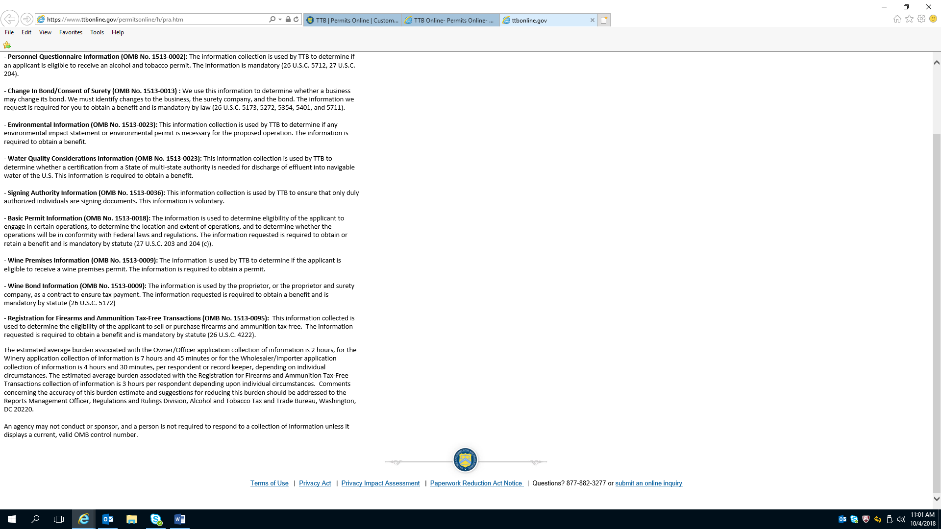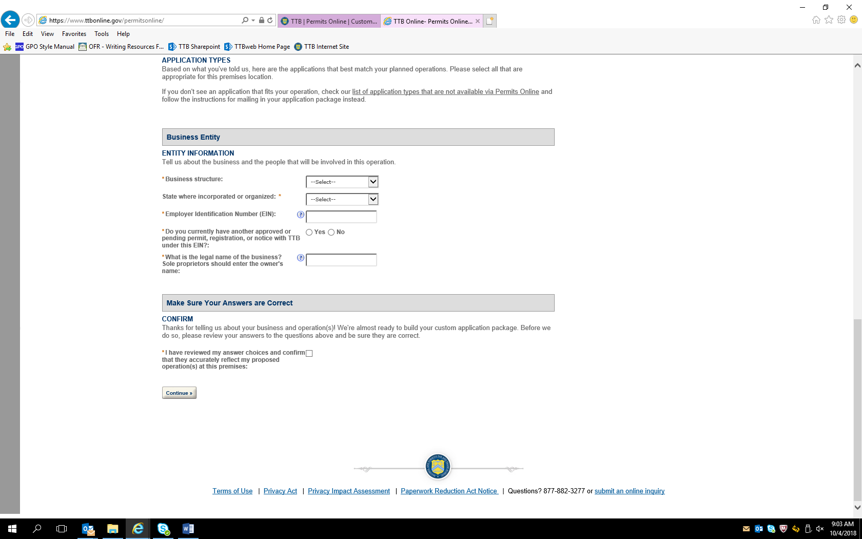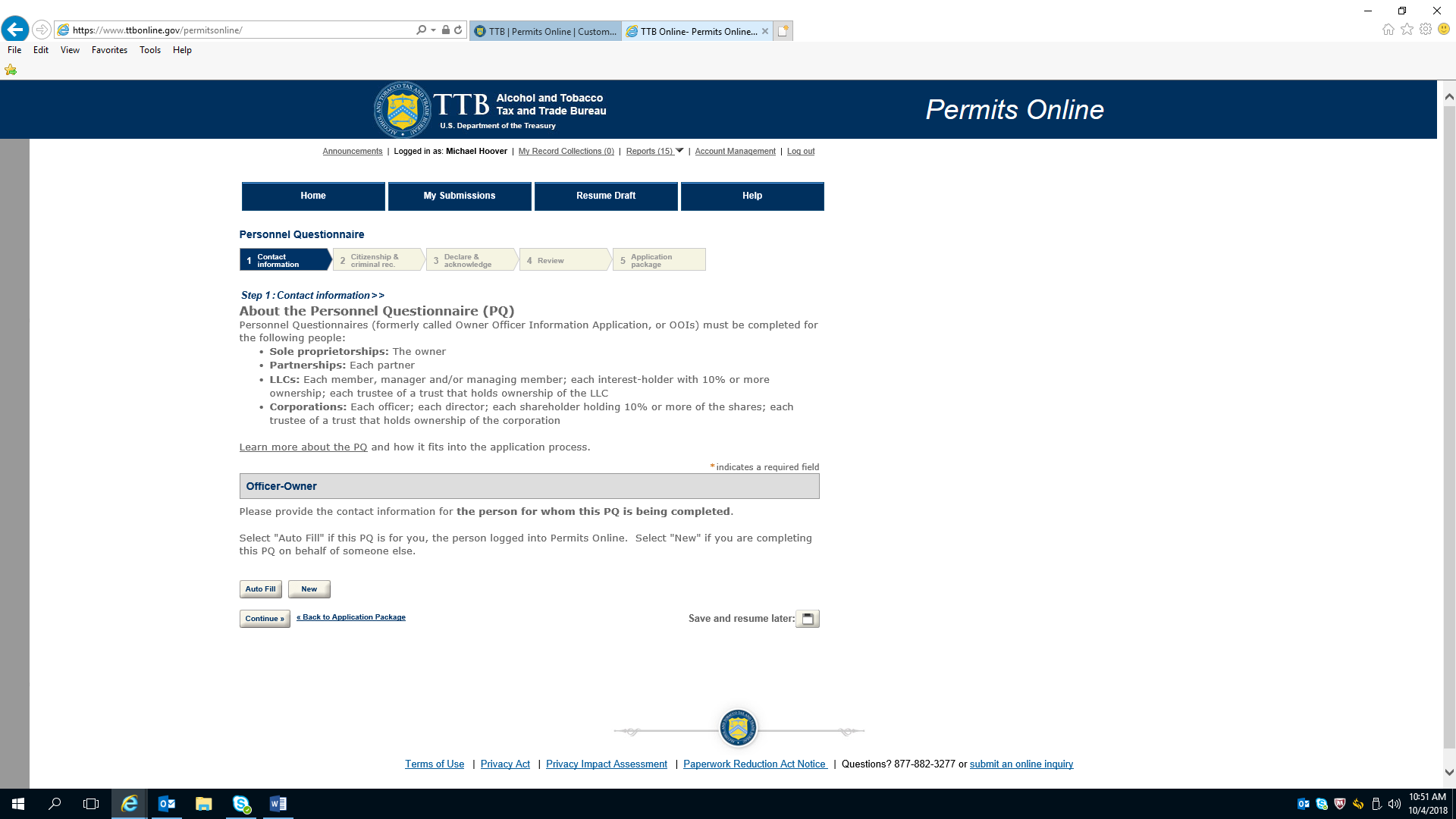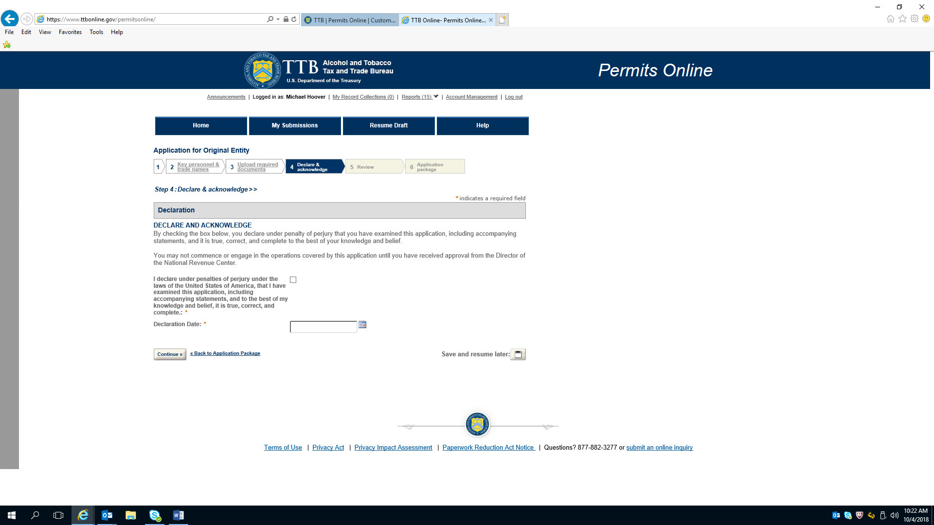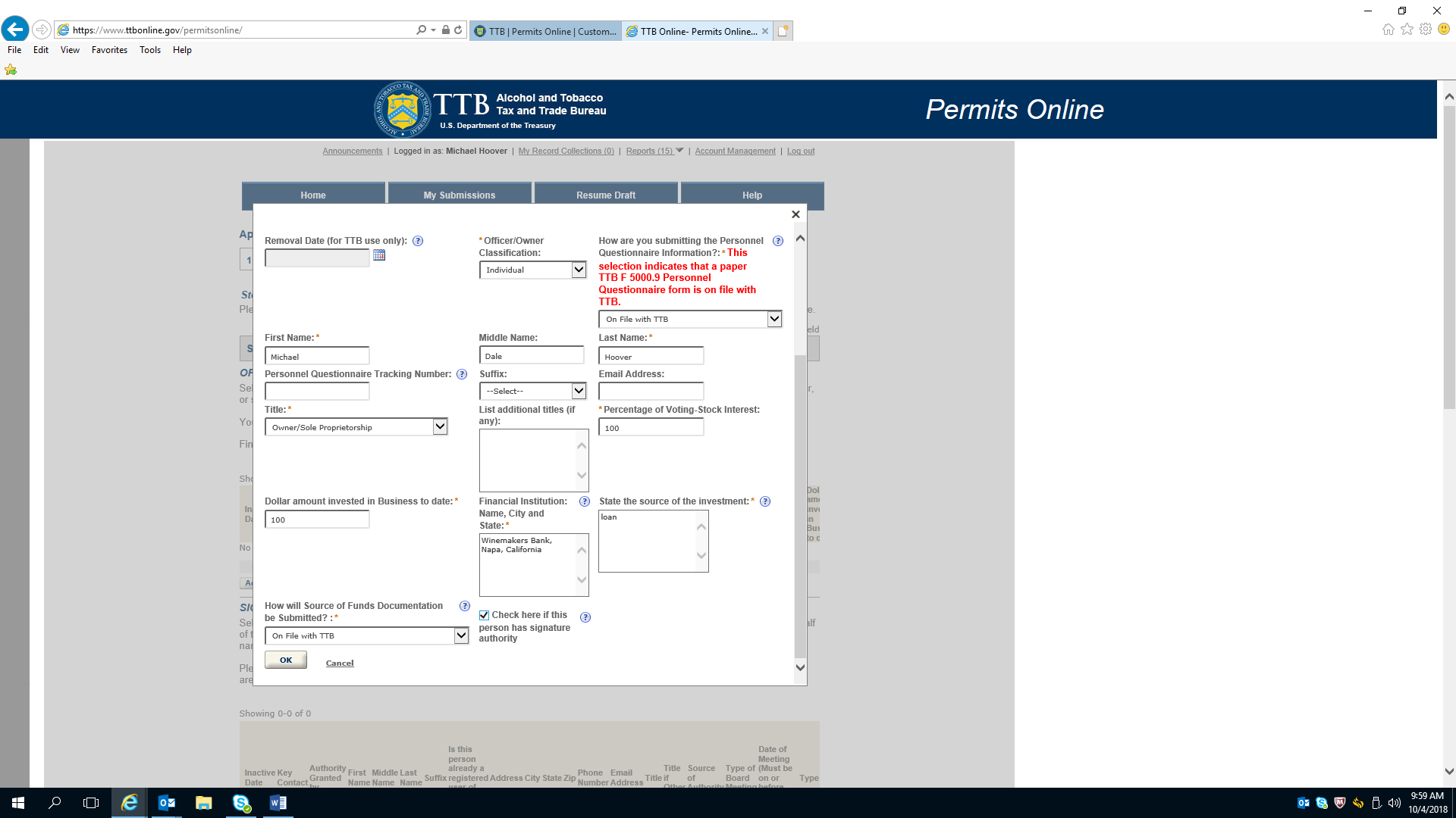 Permits Online Screen Shots — New DSP or Bonded Wine Premises FAA Act Basic Permit Applications (OMB Control No. 1513–0018) (10-2018)