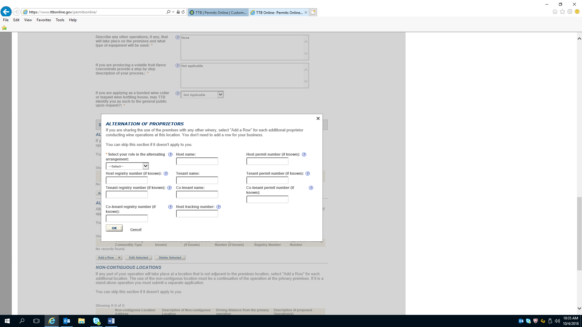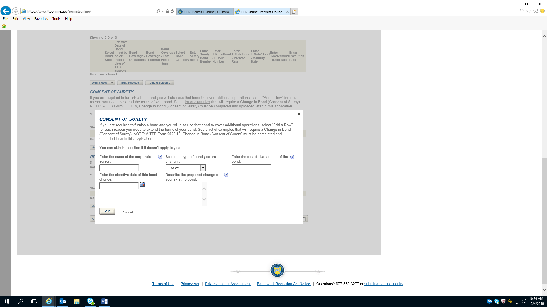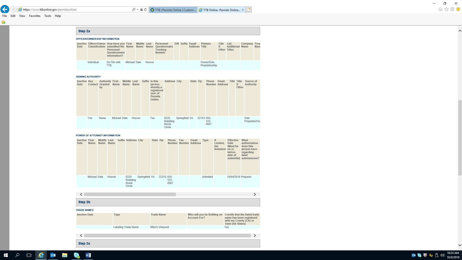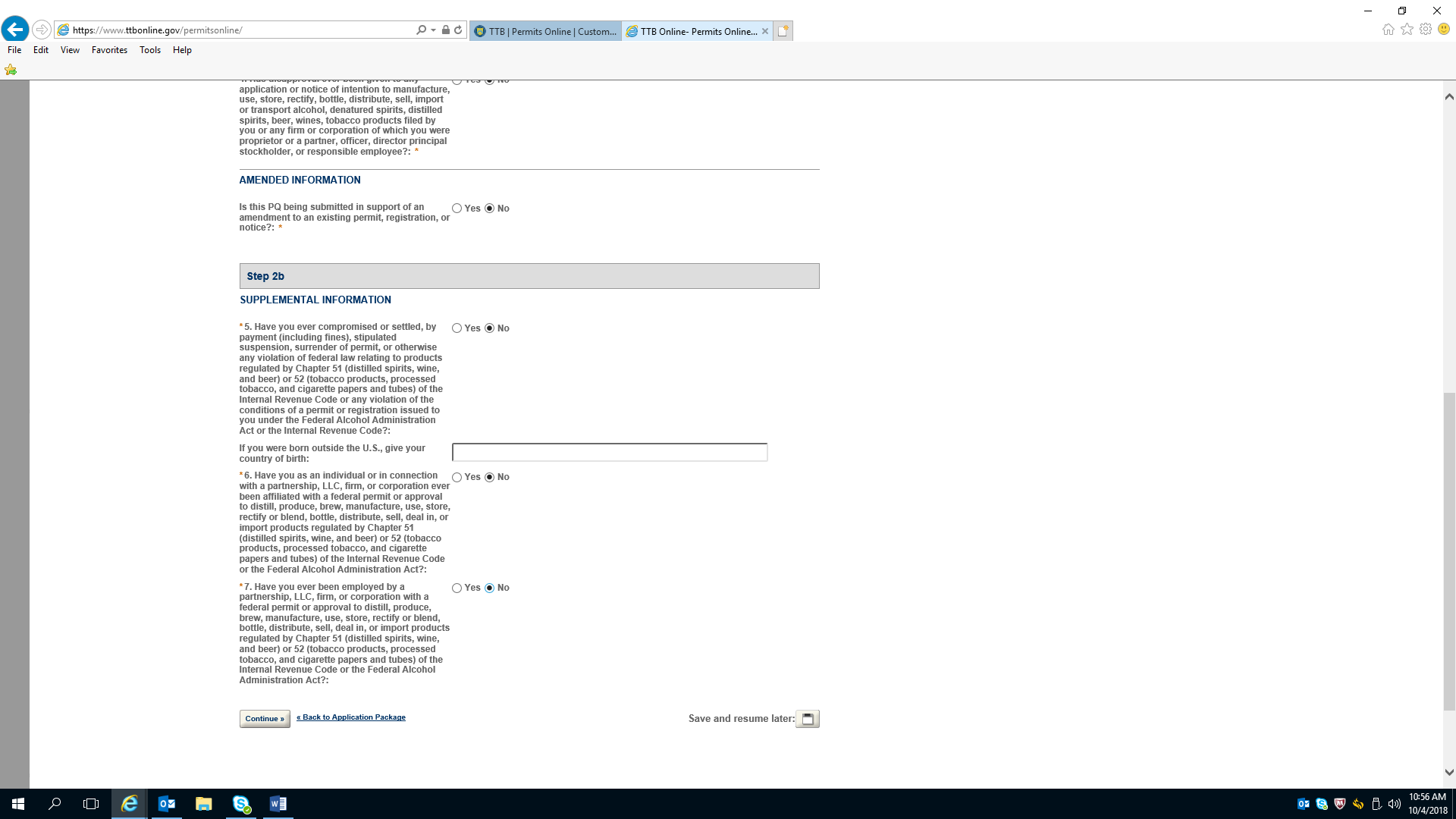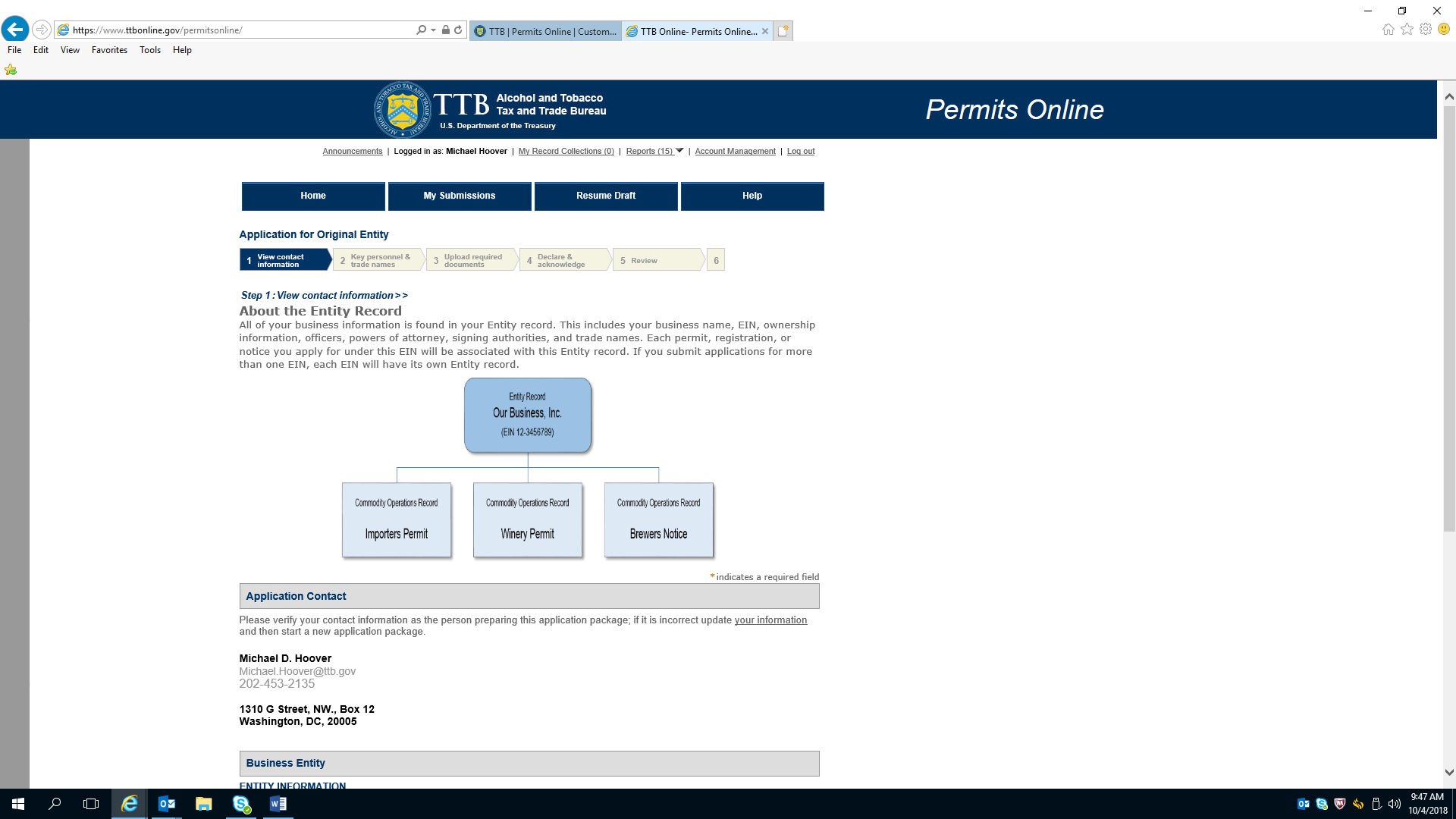 Permits Online Screen Shots — New DSP or Bonded Wine Premises FAA Act Basic Permit Applications (OMB Control No. 1513–0018) (10-2018)