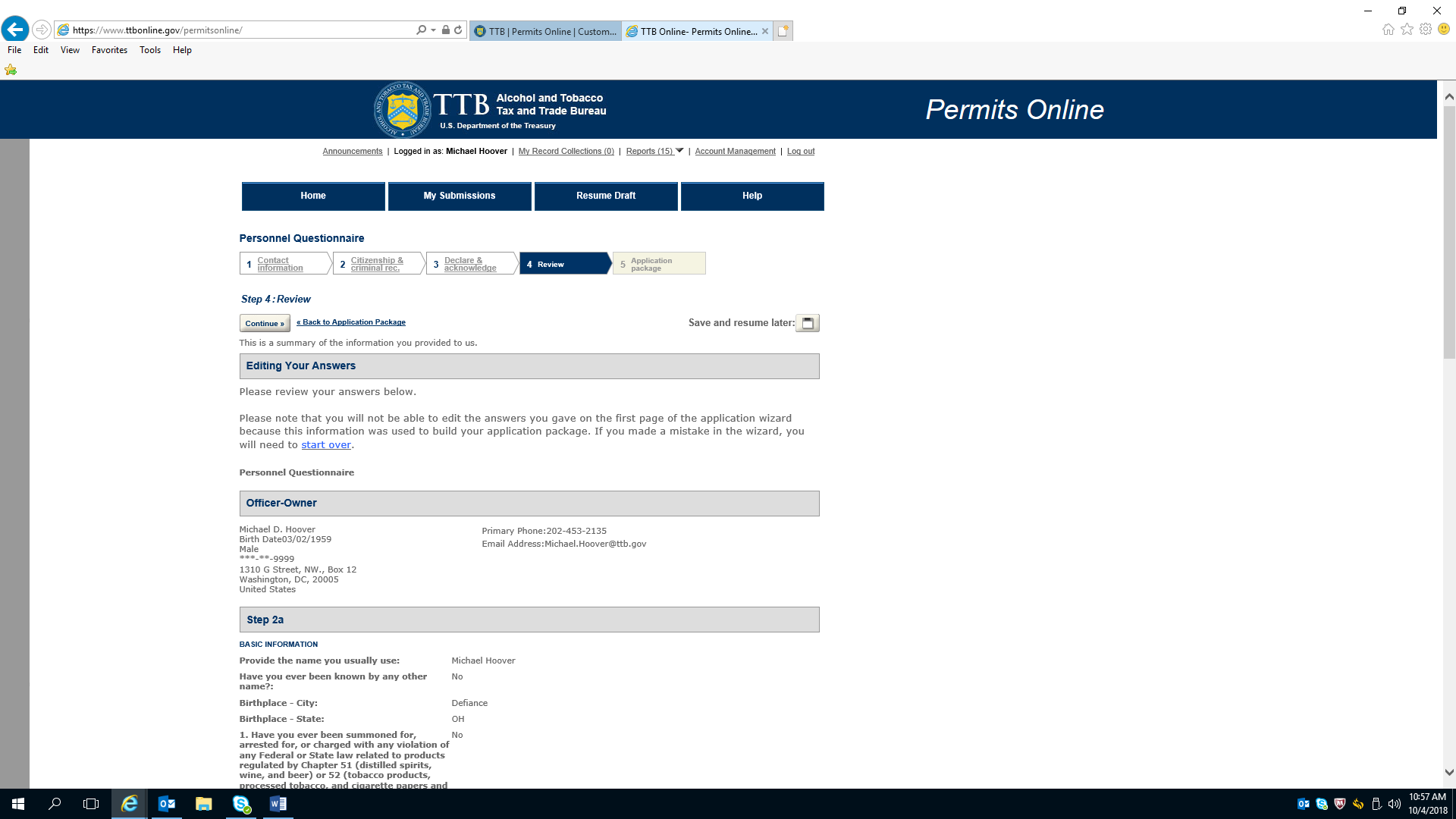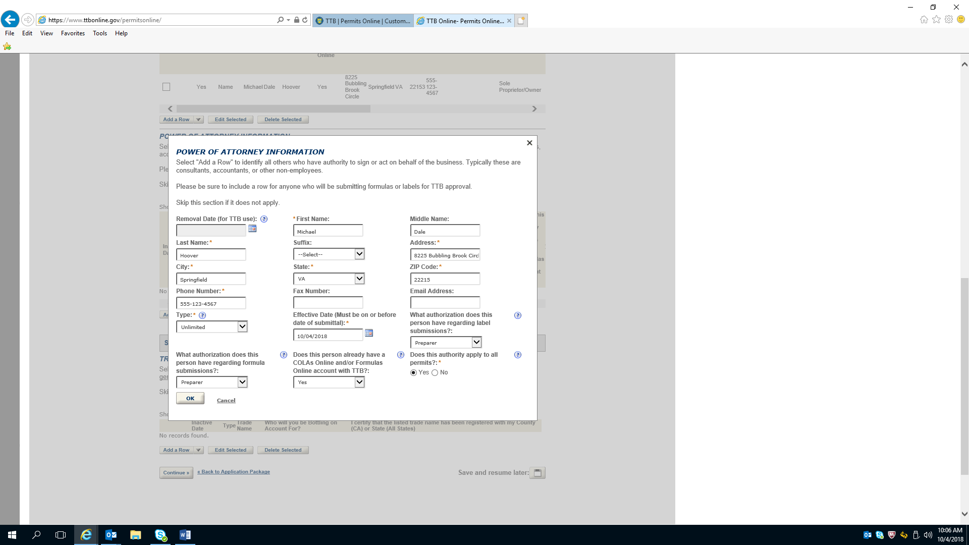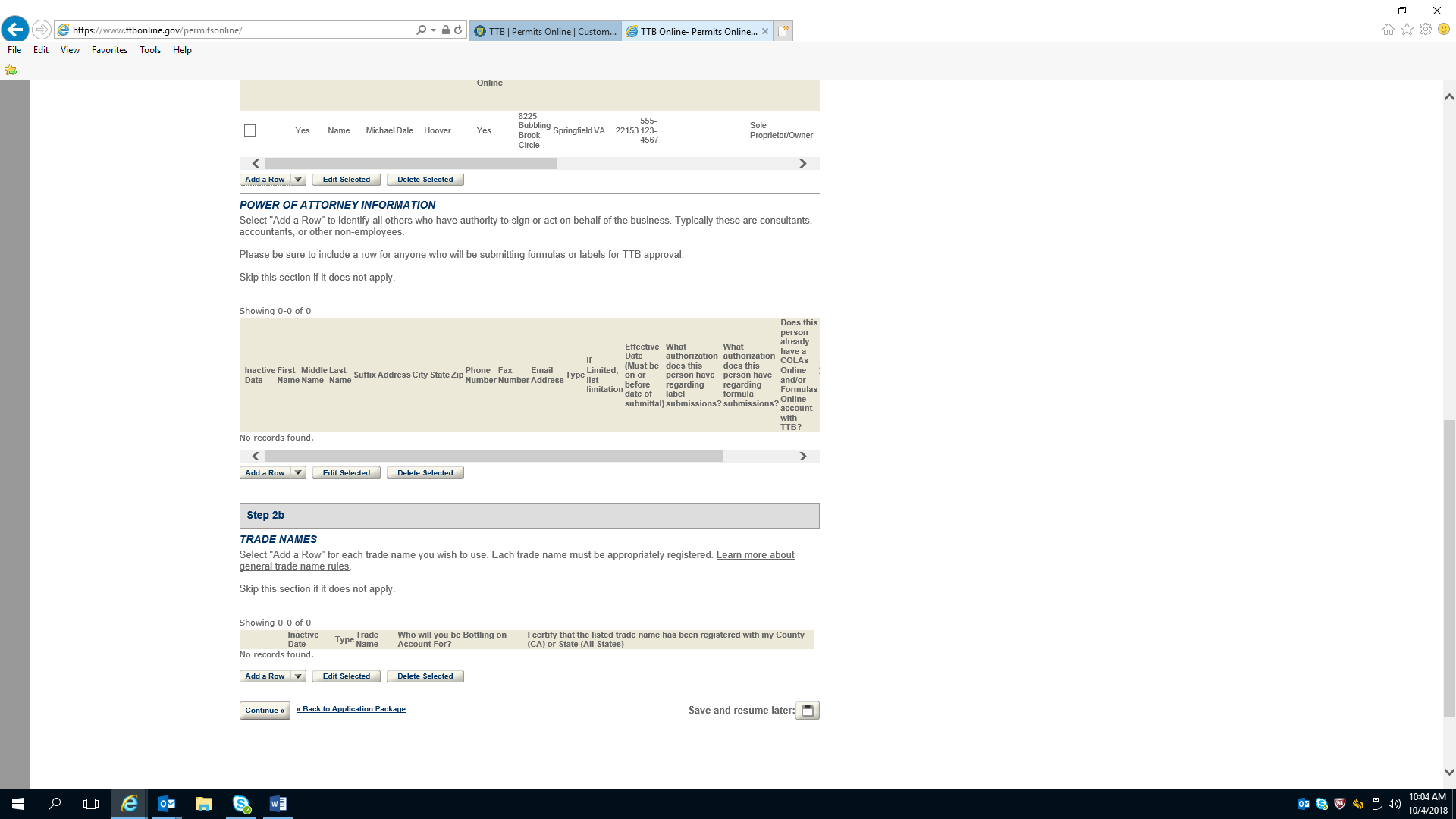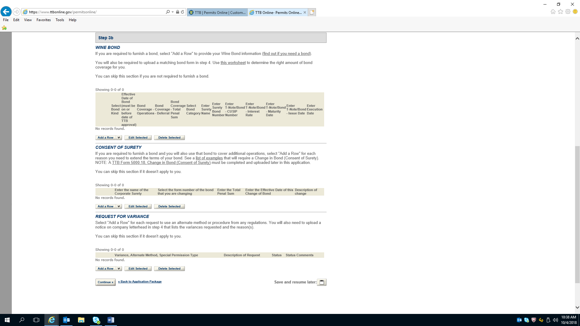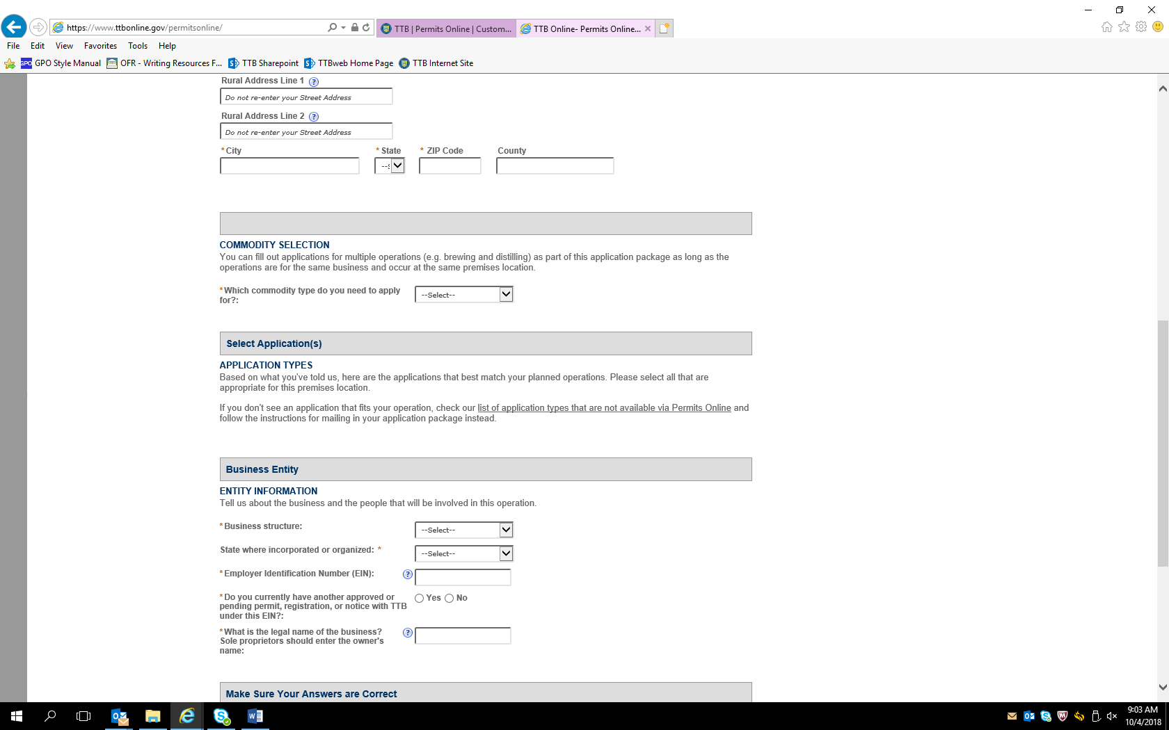 Permits Online Screen Shots — New DSP or Bonded Wine Premises FAA Act Basic Permit Applications (OMB Control No. 1513–0018) (10-2018)